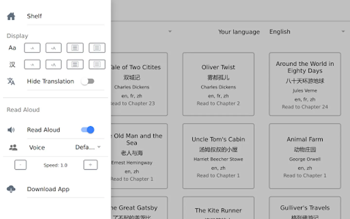 The app also provides a read-aloud feature, you can choose different accents and reading speeds, as supported by your device.Books on the shelf includes "Pride and Prejudice", "A Tale of Two Cities", "Twenty Thousand Miles Under the Sea", "Alice in Wonderland", "Around the Earth in Eighty Days", "1984", "Animal Farm", "Gulliver's Travels", "Oliver Twist", "Little Prince" and other works.
