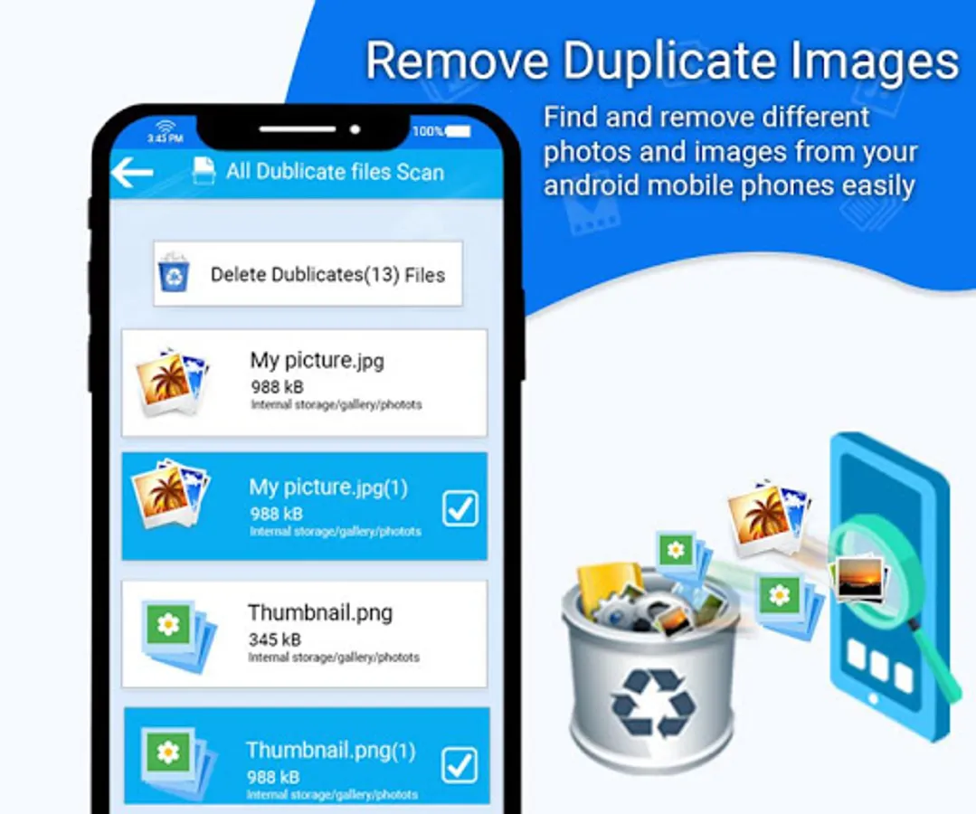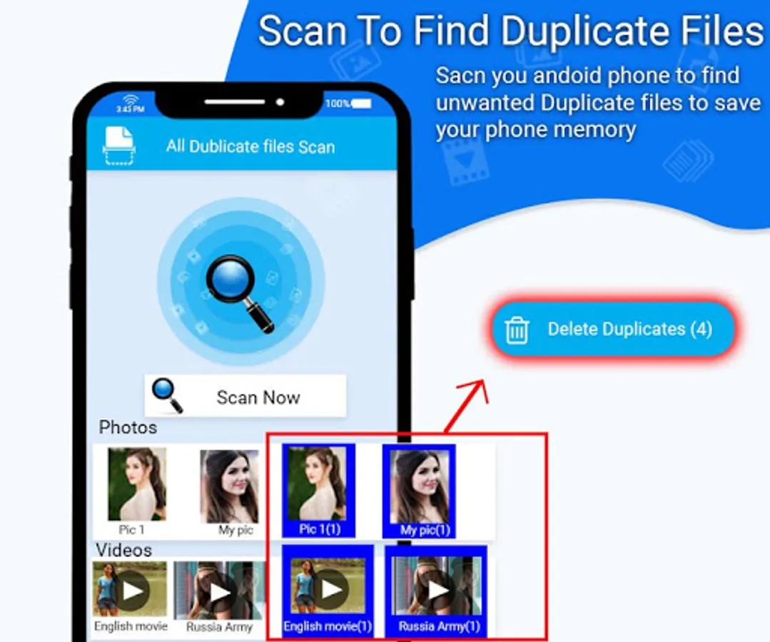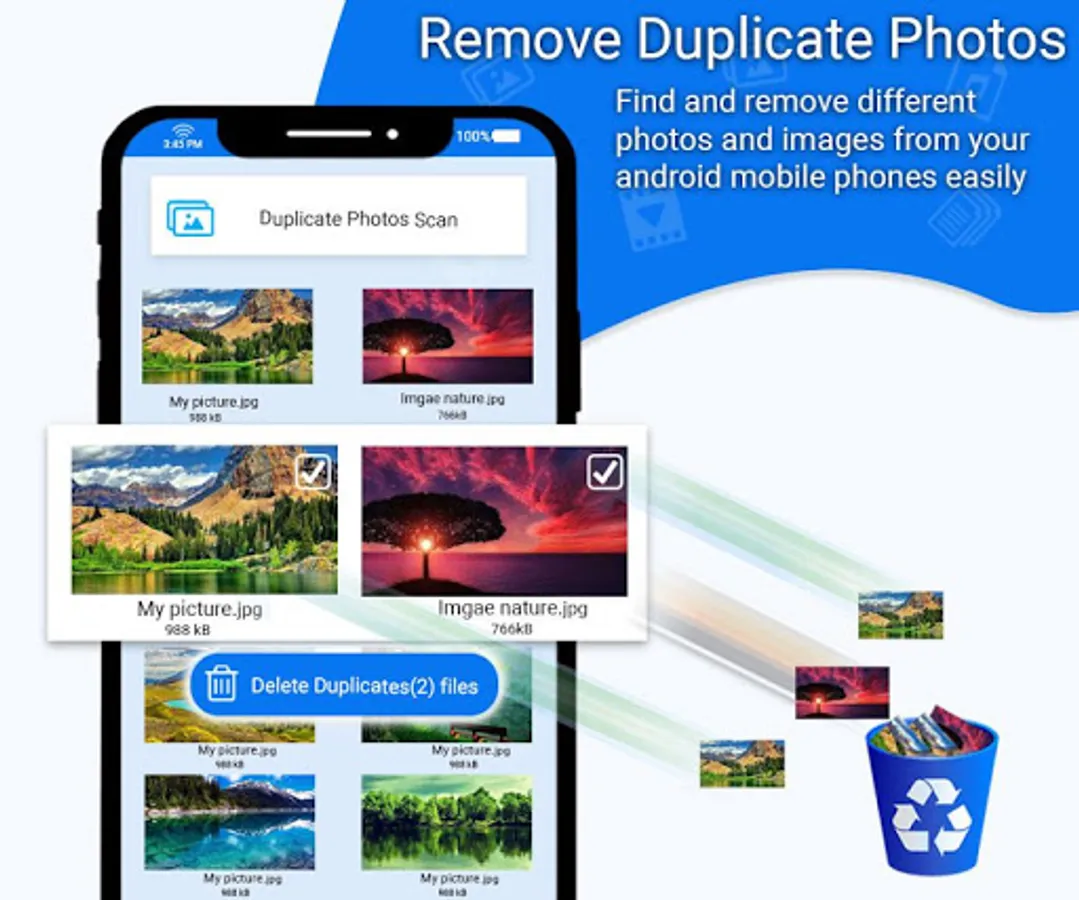 Duplicate photo remover OR delete duplicate photos: with dual file clean app you can easily find and remove all duplicated files or category wise duplicated file scan like you can scan your android phone for just duplicated photos.by using duplicated photo cleaner and duplicated photo remover feature you can just clean you phone for duplicated photos