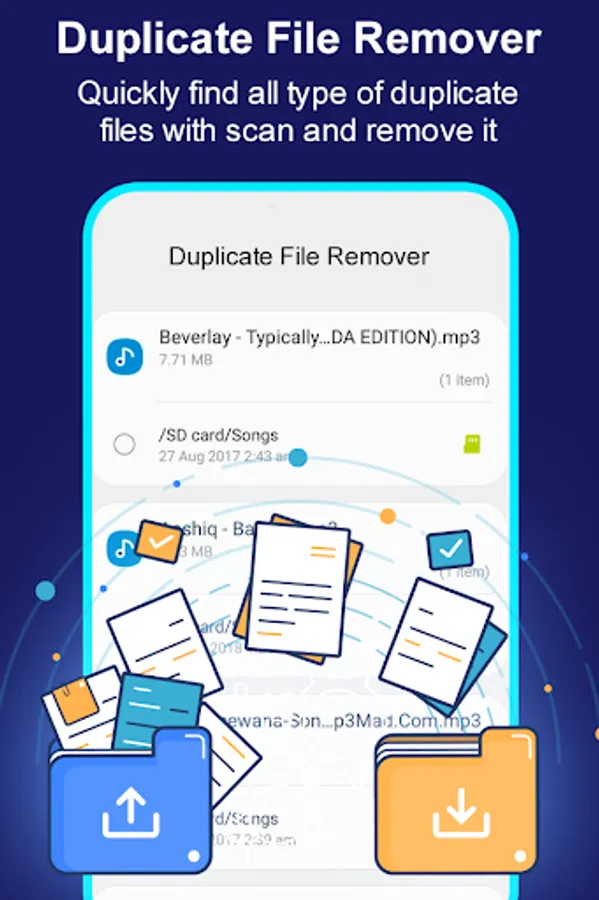 Duplicate File Remover - Duplicates Cleaner the application removes all duplicate media audio, images and videos files present in you are internal to phone memory and external storage to SD card.
