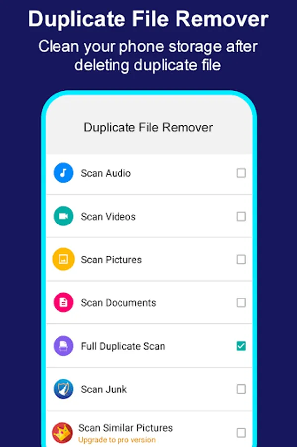 The app Duplicate File Remover will help you delete Duplicate files and free up space on your phone.