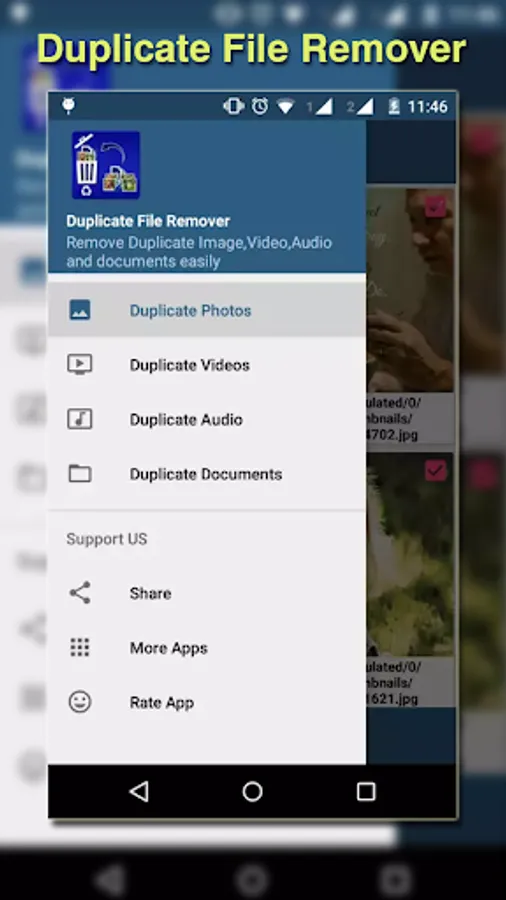 There are lot more cases where duplicate files are created and unnecessarily occupy space on your Android device and keep your memory full and we suffer just because of memory full in the device. We think that we do not have enough space in device to store something.Storage may be full just because you have lot of duplicate songs ,photos ,videos and documents in your phone.So you need to remove these things to free space in your device to keep other important things.So do not worry ,Remove Duplicate Files by this app easily on single click.