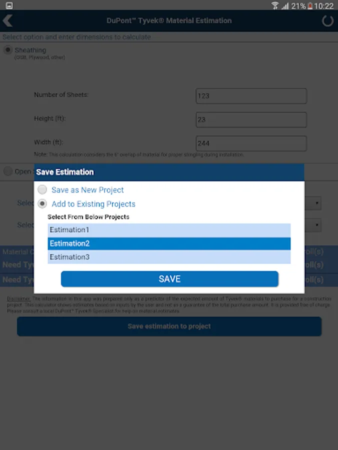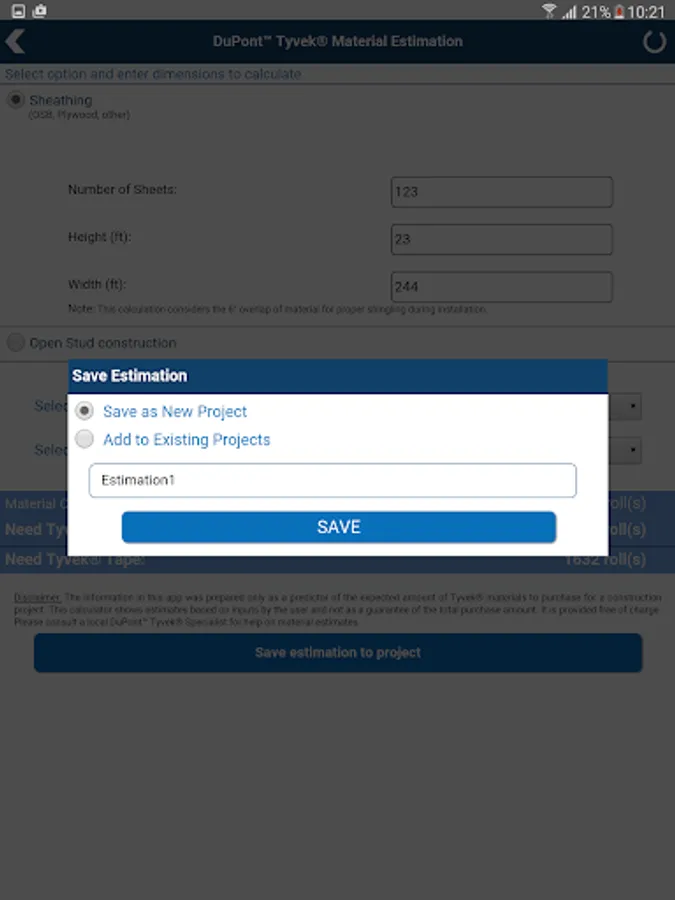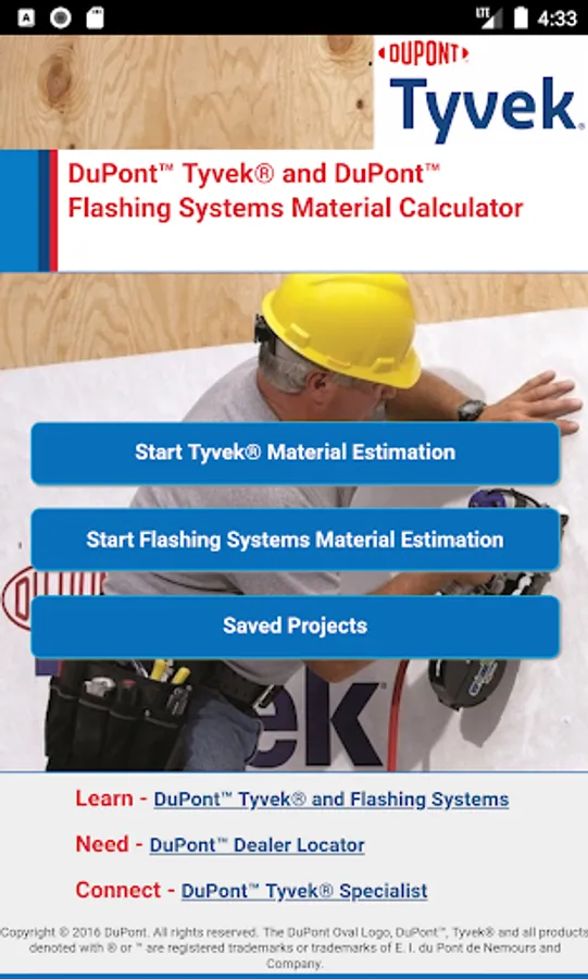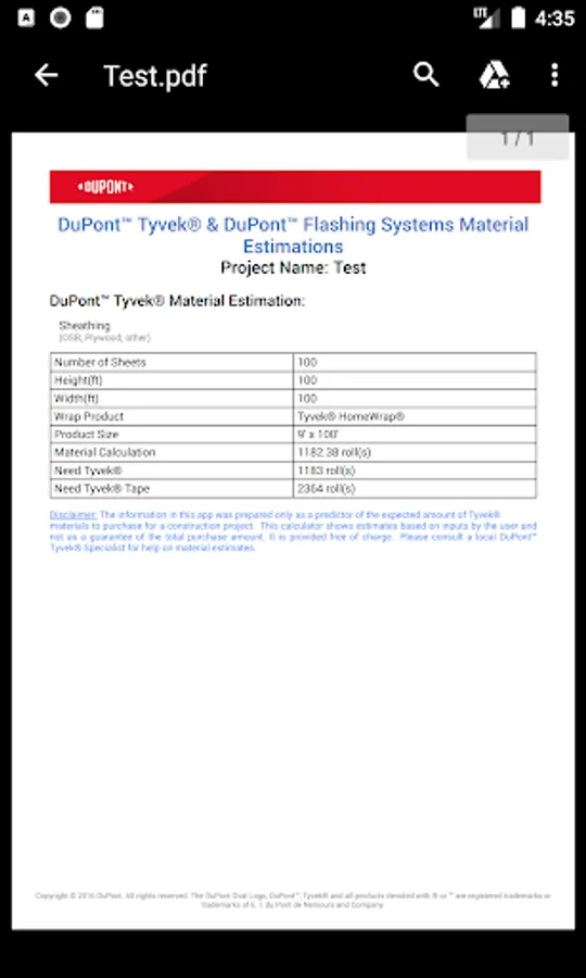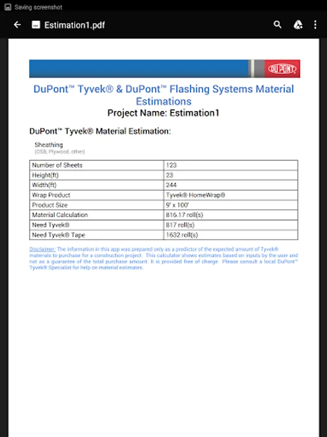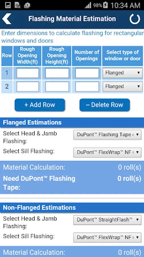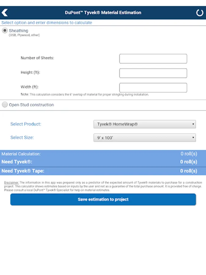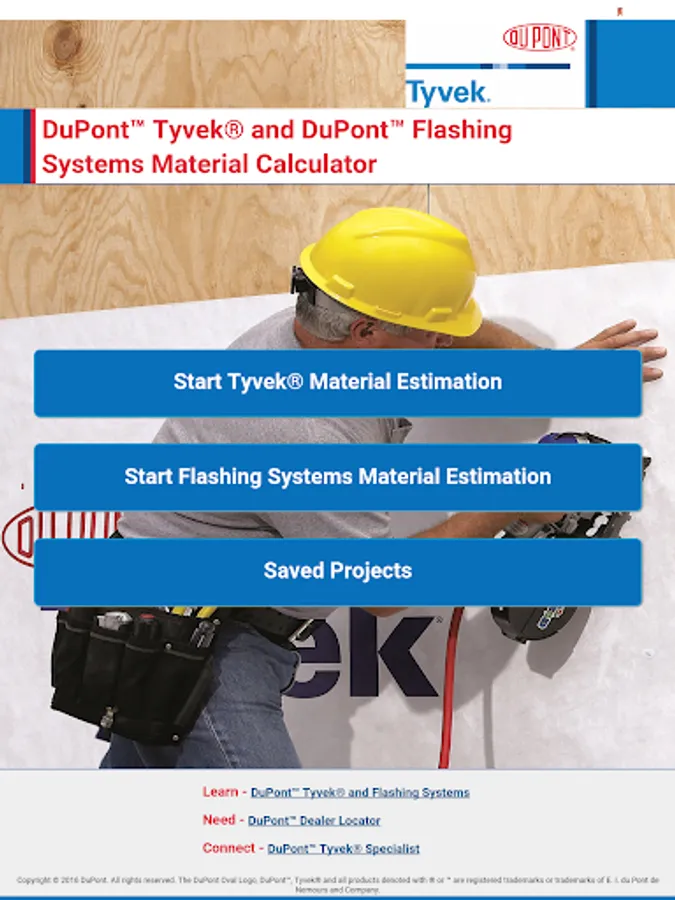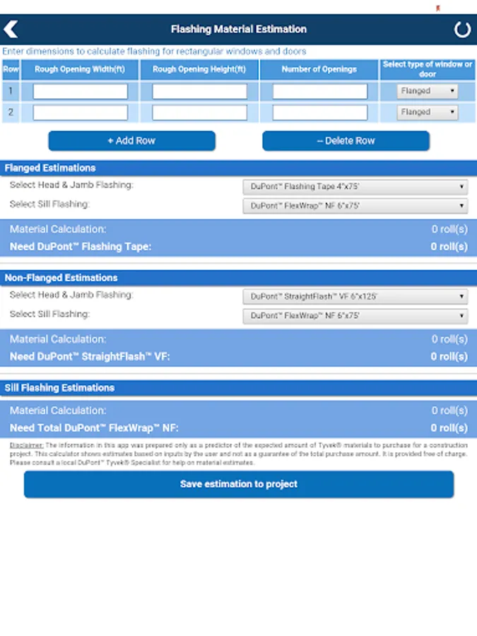 DuPont™ Tyvek® Weatherization Calculator helps users determine material quantities of Tyvek® weather barrier wrap, and flashing system products. Estimate how many rolls of material to purchase after entrering dimensions of building size and penetrations. Evaulate more accurately with the ability to choose construction use and style. Next, share calculations easily by saving and sending PDF files.