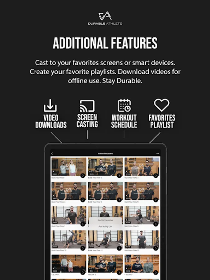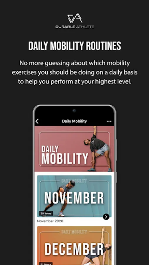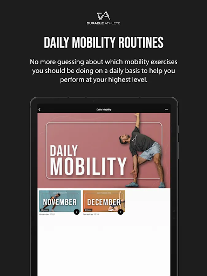 The Durable Athlete app is the ultimate training app designed to empower your fitness and health journey. This app is perfect for anyone who is looking to integrate movement and mobility practice into their everyday routine as well as supplement any preexisting exercise and fitness program you may be currently engaged in.