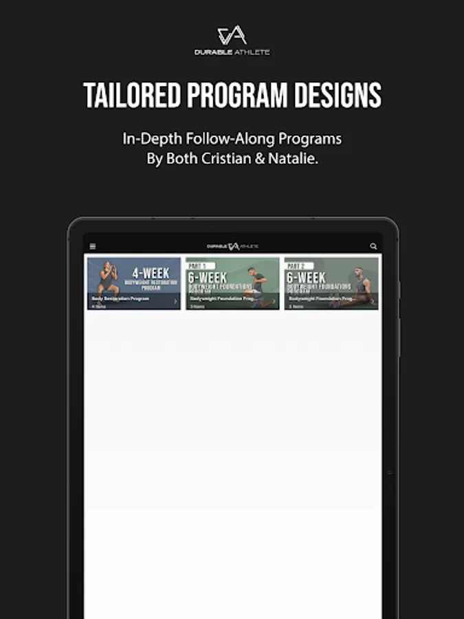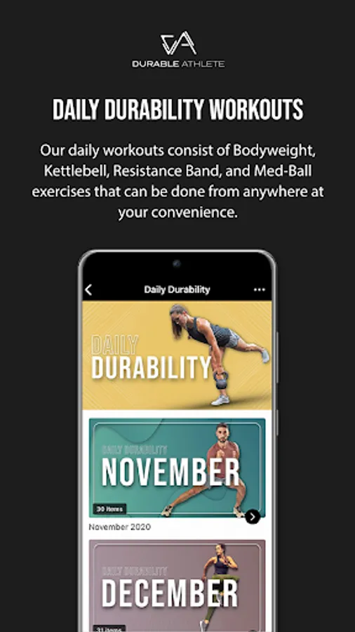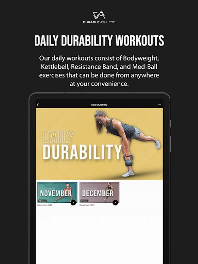These workouts would consist of mainly bodyweight, kettlebell, medicine ball, and resistance band exercises. Also included in the app are lifestyle and nutritional tips to help you optimize your potential. Stay Durable.
