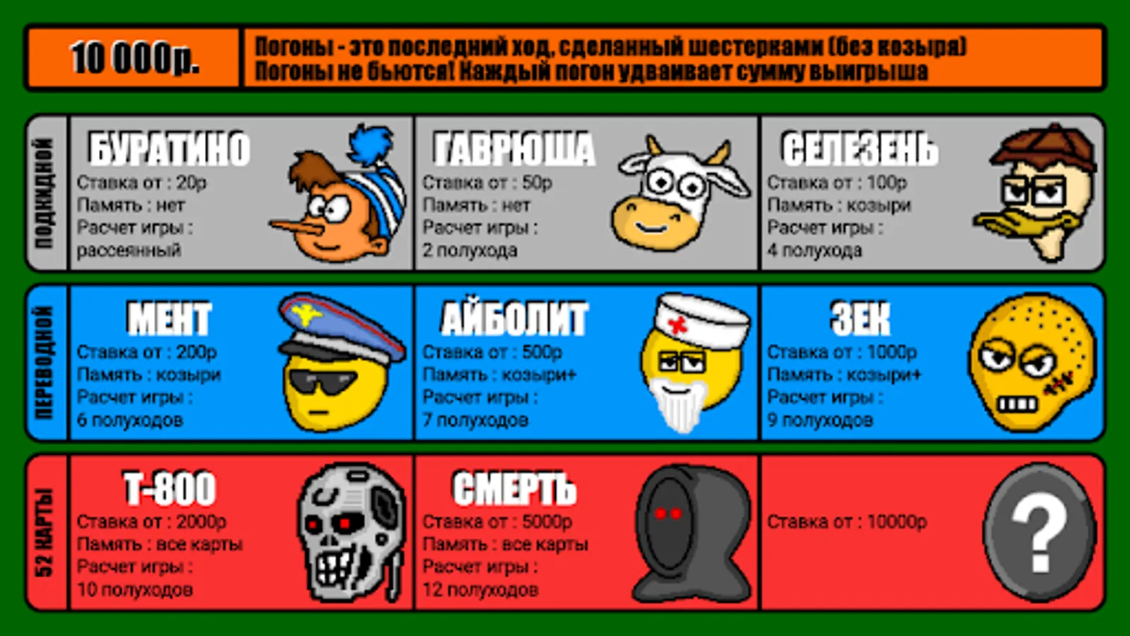 Rules of the Game (Thrown, translated, 52 cards), as well as the experience of opponents will gradually increase! And if you can do it - you will be able to fight with the most recent contender - and to find out who it is)))