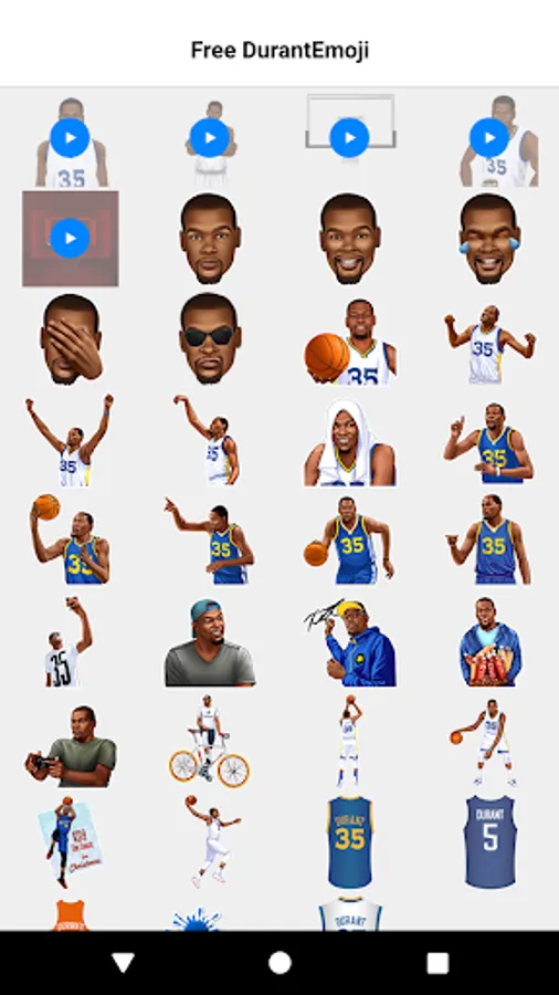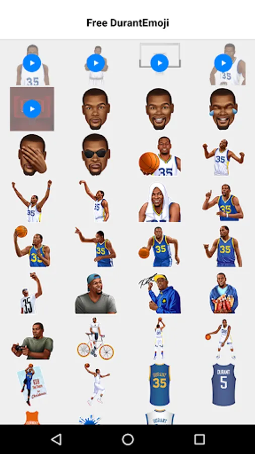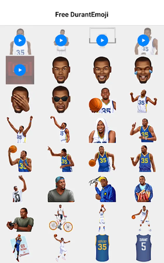 35 Emojis curated by Kevin Durant including a mix of animated gifs and static emojis with MVP slam dunk action, text bubbles, and KD memorabilia.