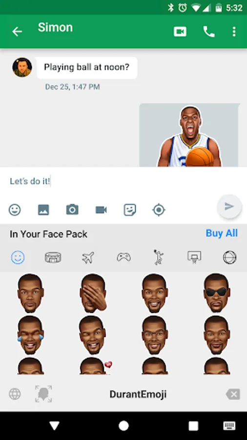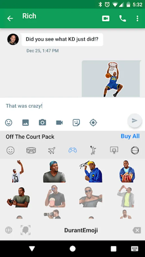 Additional DurantEmoji packs available for purchase include emojis for KD on the home court, KD's personal life, KD playing a road game, as well as KD's superb and exclusive animations!