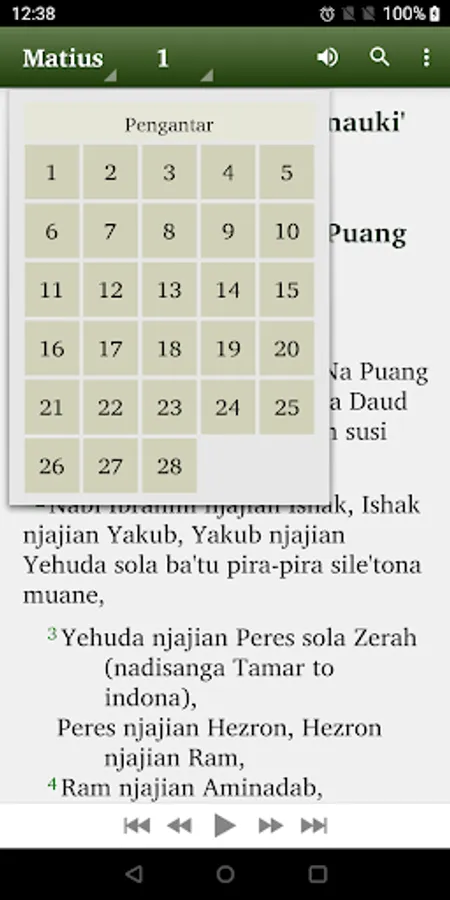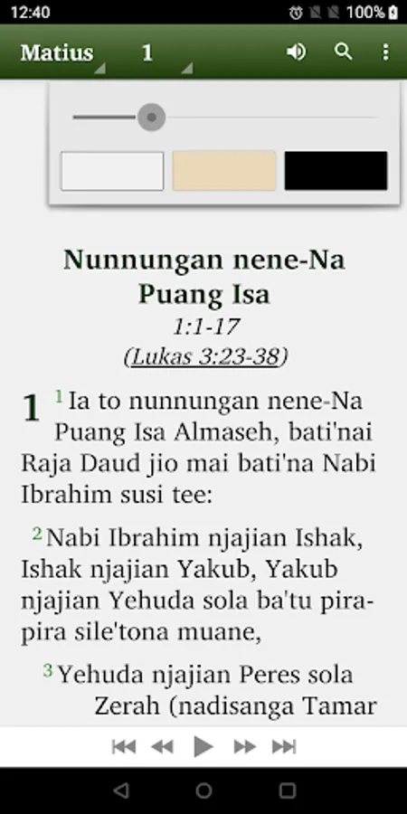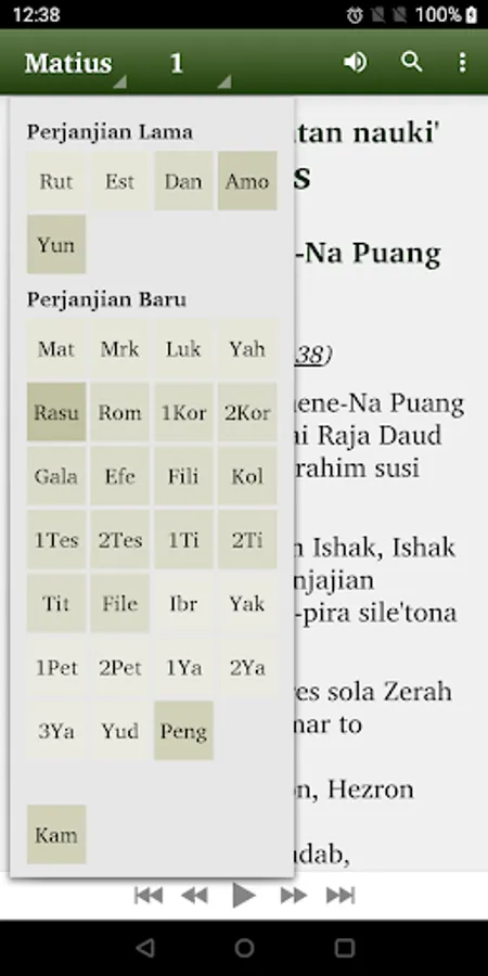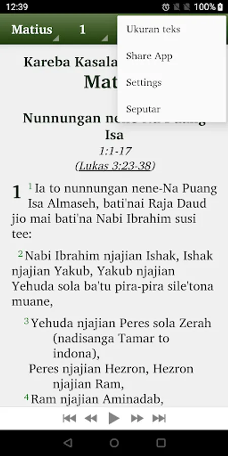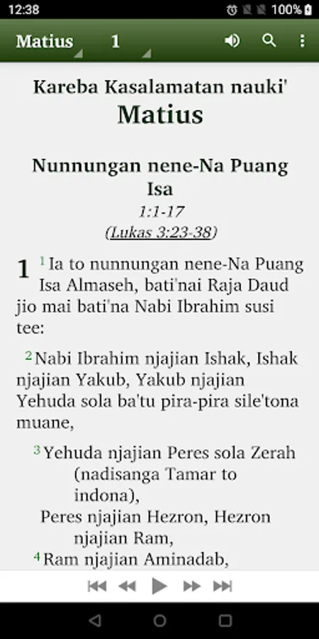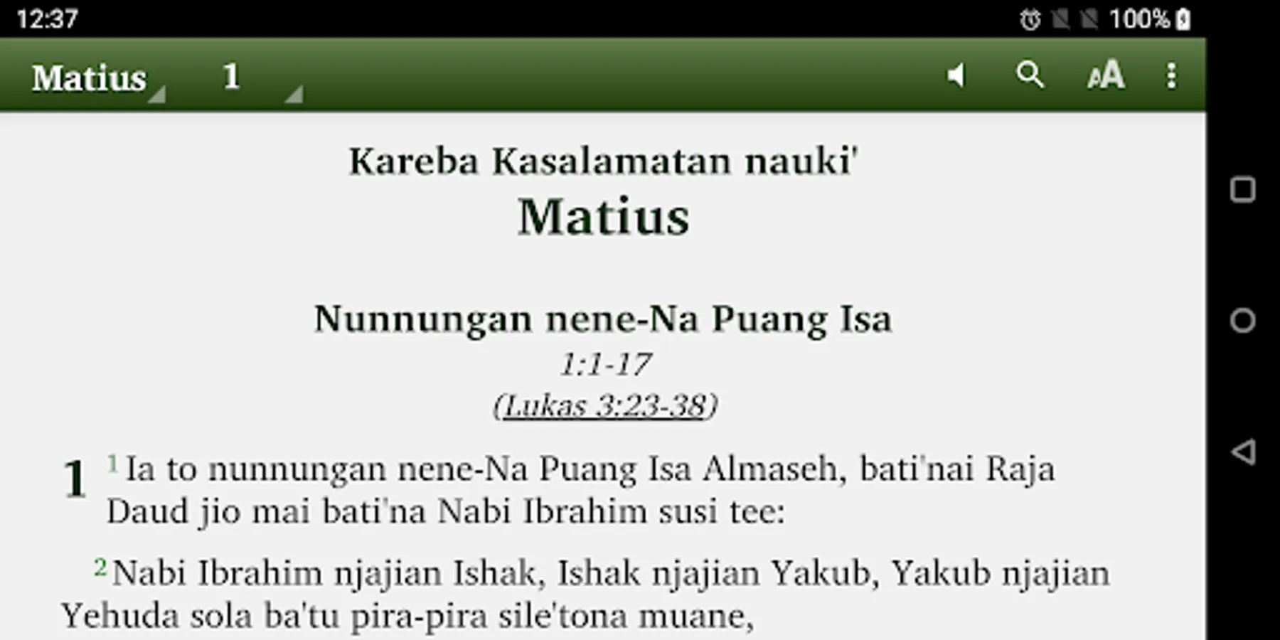 This is the Duri language Bible app for Android. This version contains both the New Testament and portions of the Old Testament (Joshua, Ruth, Proverbs, Amos, Jonah, Daniel and Esther), as well as downloadable audio recordings for the entire New Testament to listen to while reading. Free download.