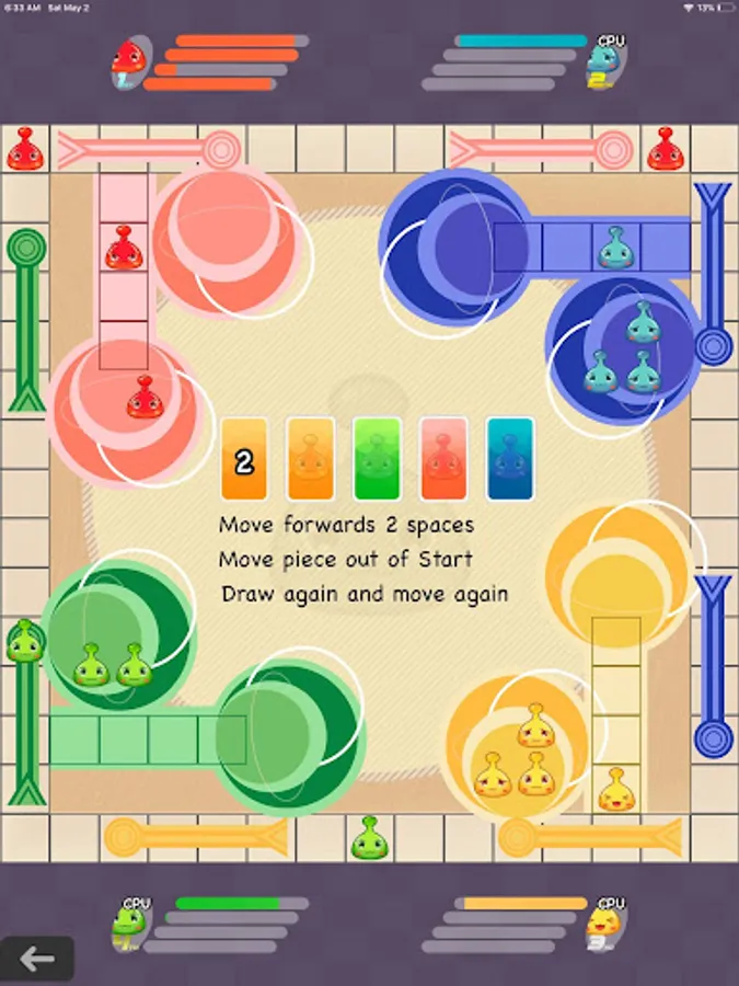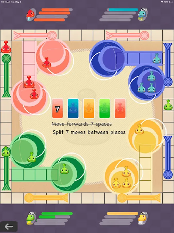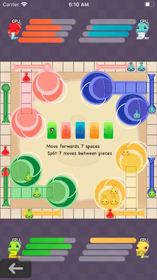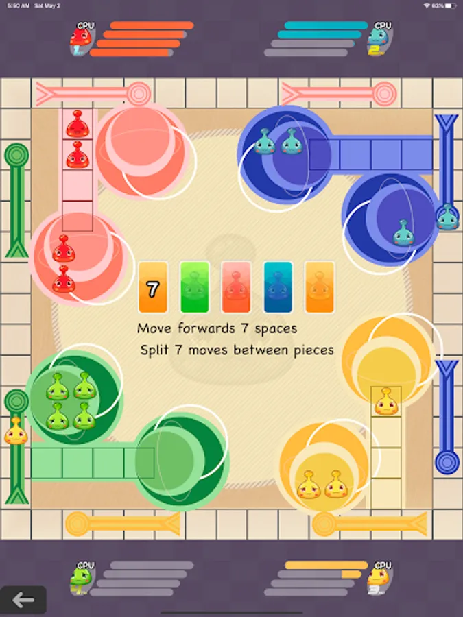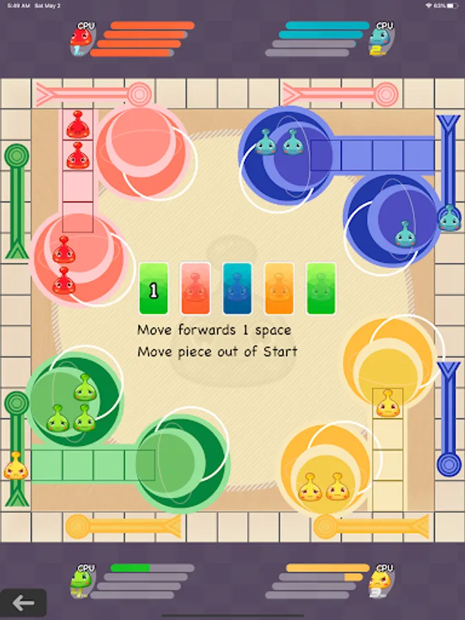 Move around the board clockwise and try to get all four of your pieces into the ending area. Different cards influence your movement and enable special moves to be performed that can quickly turn the tides on your opponents. But be careful! Your opponents have access to the same set of moves.