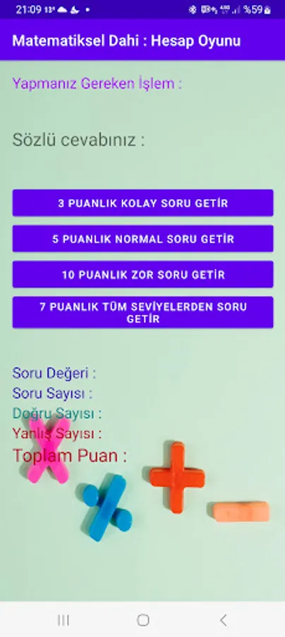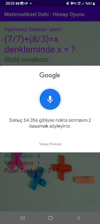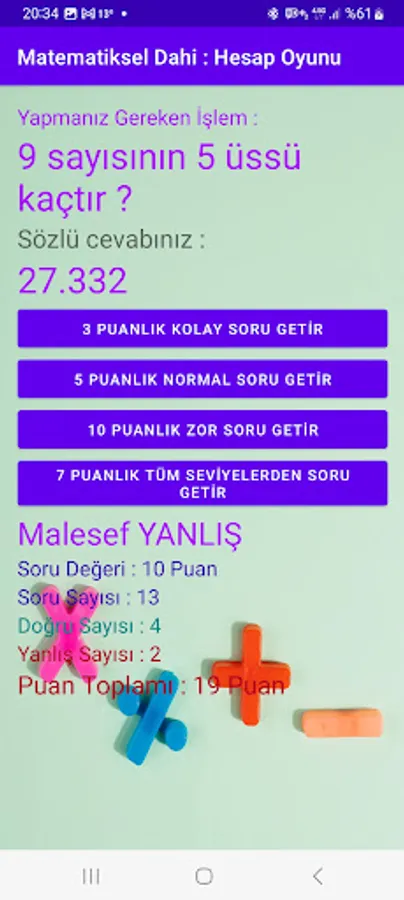 Our game calculates half, one third, two-three or seven times, square and cube, 18-30% and 130% of any number determined by the system, from easy to difficult in a short time, or the result of the formula in the format 3x-6=30, It is a mathematical game based on the fact that you tell the program with your voice, that is, by speaking, and you answer whether it is right or wrong. Suitable for children of all ages, teenagers and adults. Improve your math and become a genius yourself....