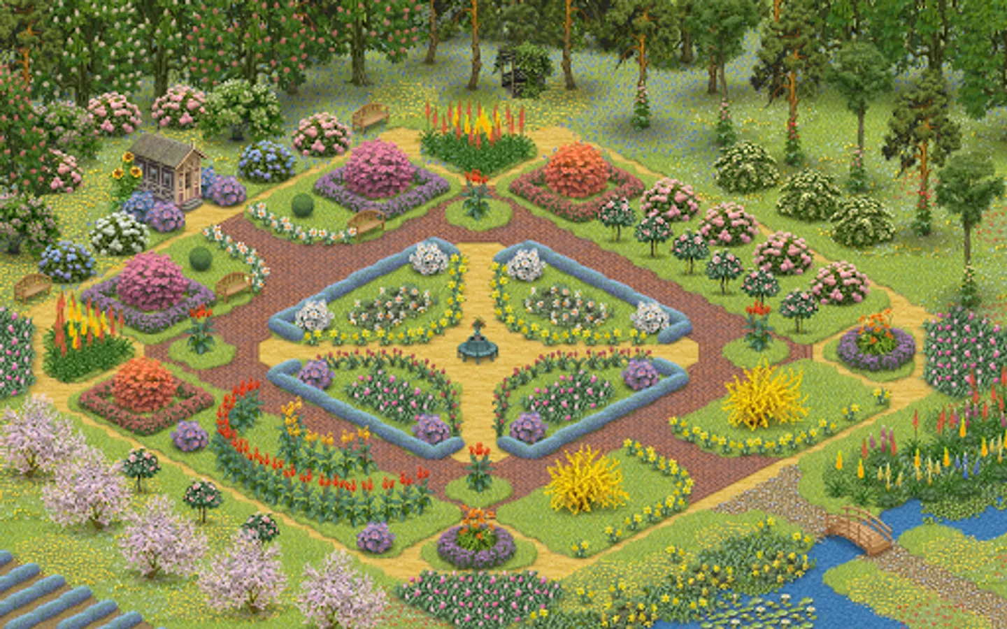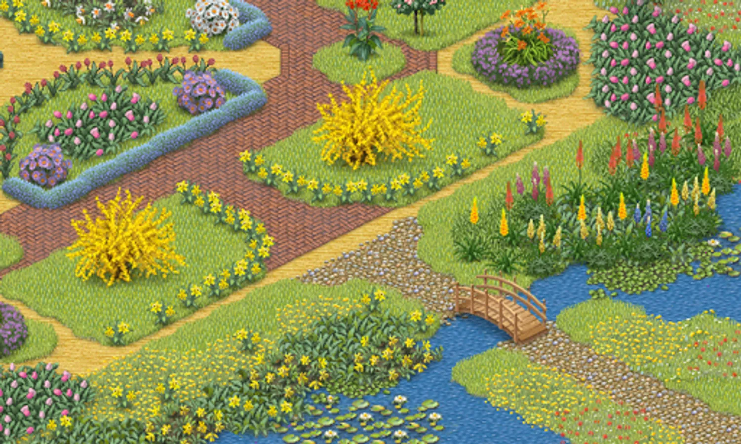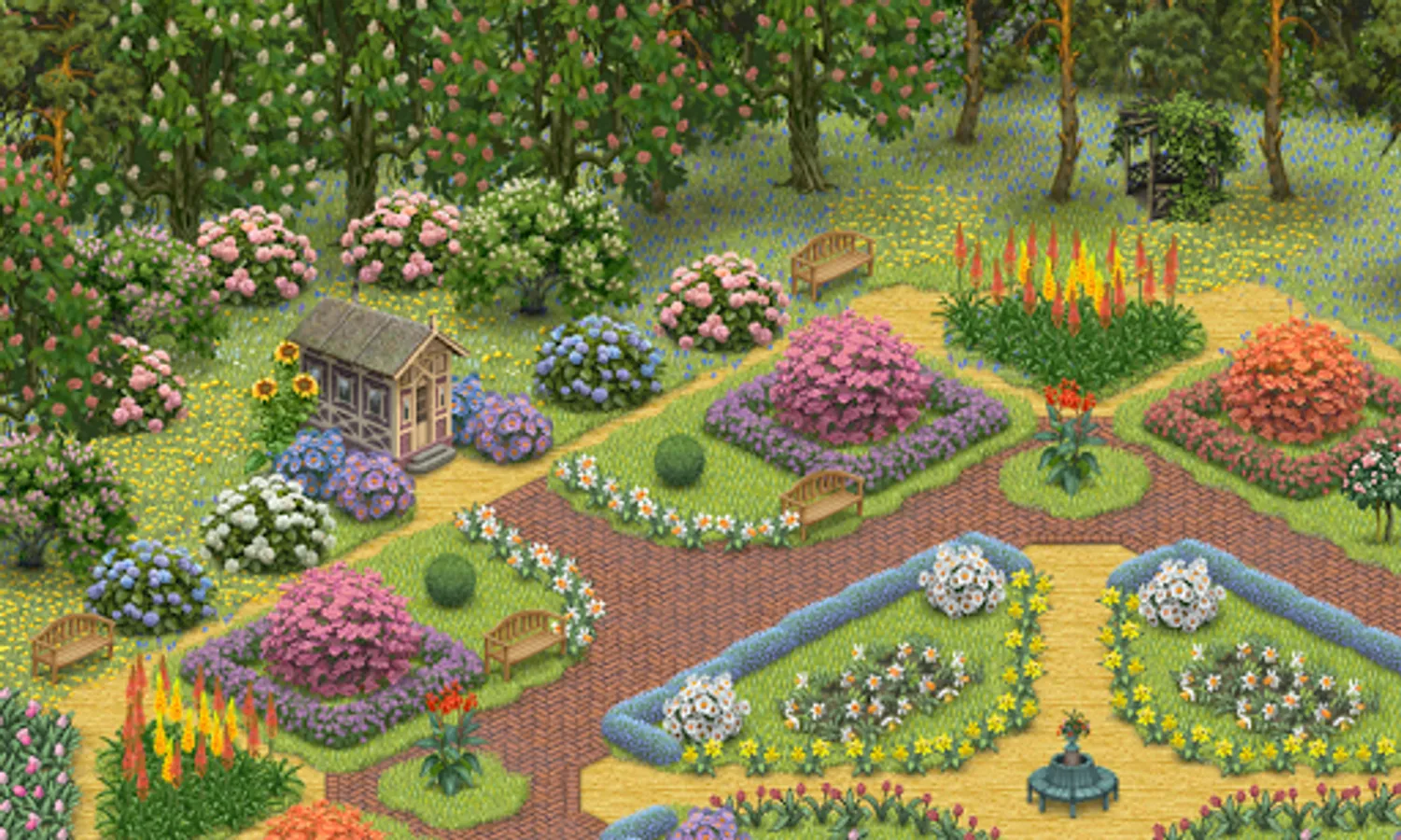 This pack contains a selection of flowers in a variety of shapes, colors and sizes - from daffodils to blooming horse chestnut. Azaleas or hydrangeas both available in three different colors allow you to paint with color. Gentle patches of lavender contrast with tall silhouettes of canna lily and foxtail lily, complemented by three colors of asters. The pack also contains five new surfaces: English-style herring-bone brick pavement, three types of flowering meadow (blue crocuses, dandelions and poppies) as well as white daffodils. The number of combinations of shapes and colors is innumerable!