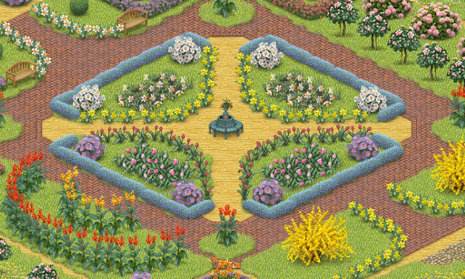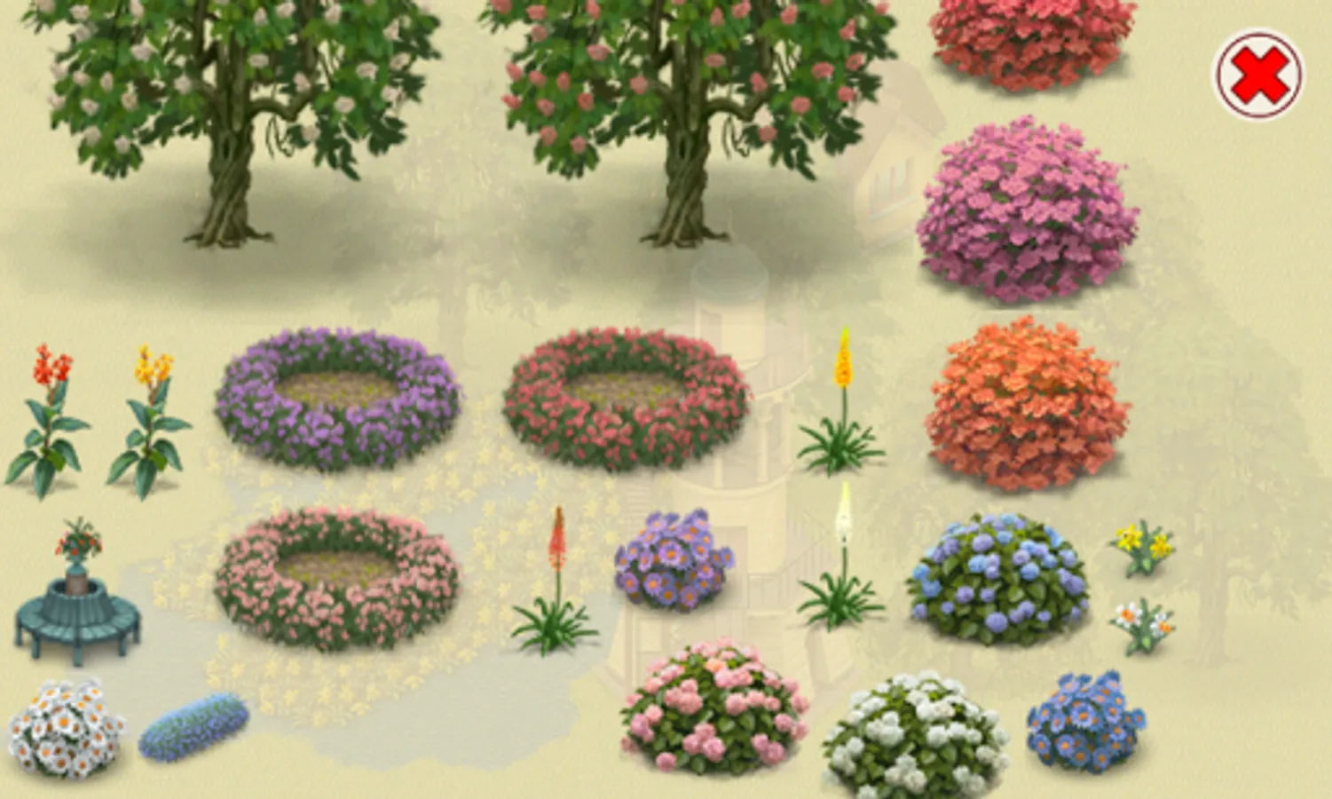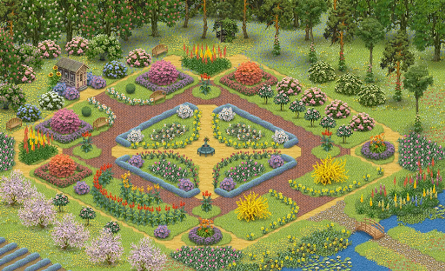 This pack contains a selection of flowers in a variety of shapes, colors and sizes - from daffodils to blooming horse chestnut. Azaleas or hydrangeas both available in three different colors allow you to paint with color. Gentle patches of lavender contrast with tall silhouettes of canna lily and foxtail lily, complemented by three colors of asters. The pack also contains five new surfaces: English-style herring-bone brick pavement, three types of flowering meadow (blue crocuses, dandelions and poppies) as well as white daffodils. The number of combinations of shapes and colors is innumerable!