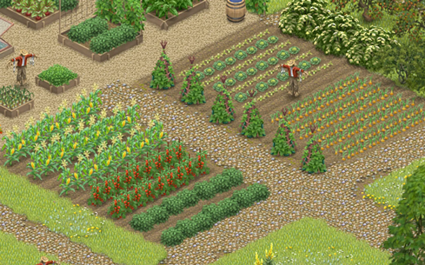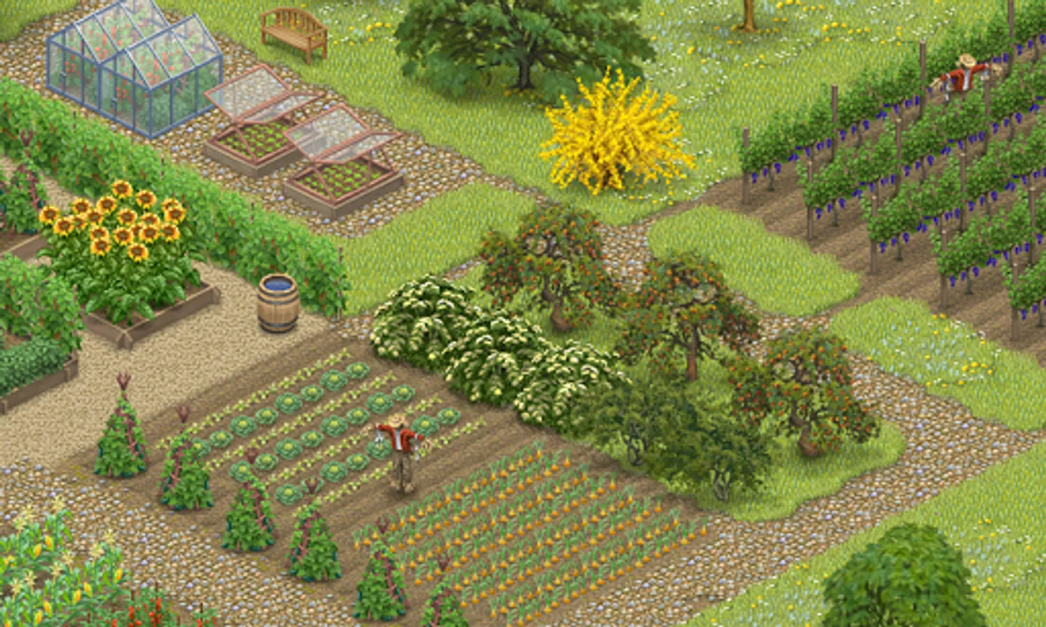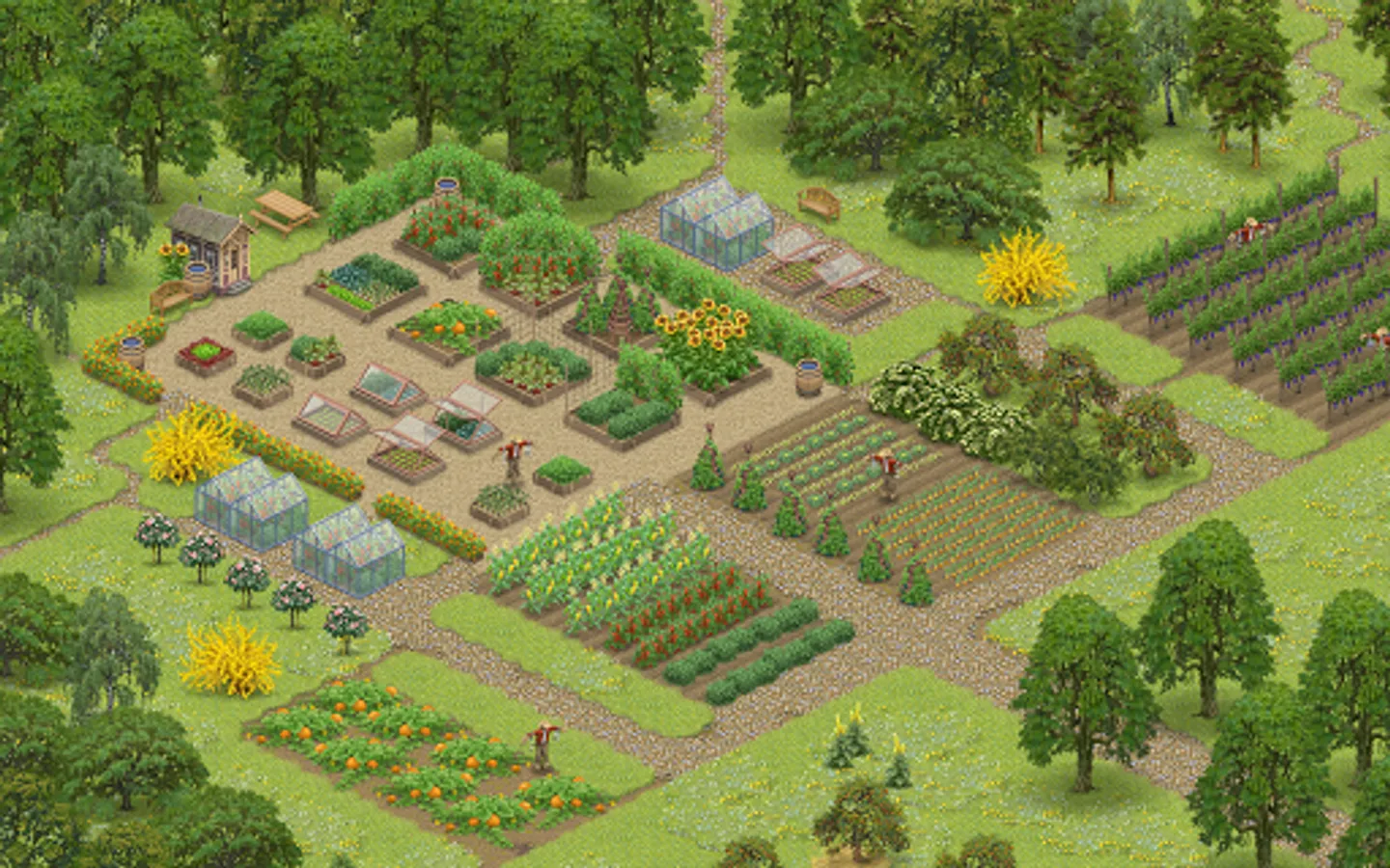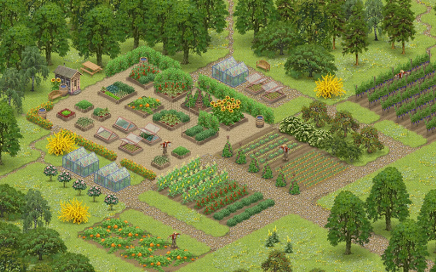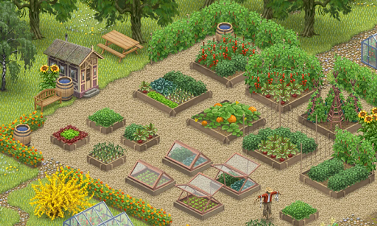 Welcome to our Vegetable Garden! Lay out your crops just as you wish, with nothing to hold your imagination back! Create striking patterns with raised beds of two sizes or design larger patches of all kinds of vegetables: sweetcorn, potatoes, tomatoes, beet, onions, cabbage and lettuce. Start your own vineyard and place scarecrows in it so that the birds don't eat all of your harvest! Store the rain water in beautifully weathered wooden barrels and set up supports for climbing beans and cucumbers! Line your paths with the edible nasturtium flowers and protect your more fragile plants in several kinds of greenhouses! Grow giant pumpkins for Halloween and best of all, when the harvest time comes, enjoy the delicious yield of your vegetable garden with your friends at the picnic tables! Rejoice the miracle of your food growing in your backyard!