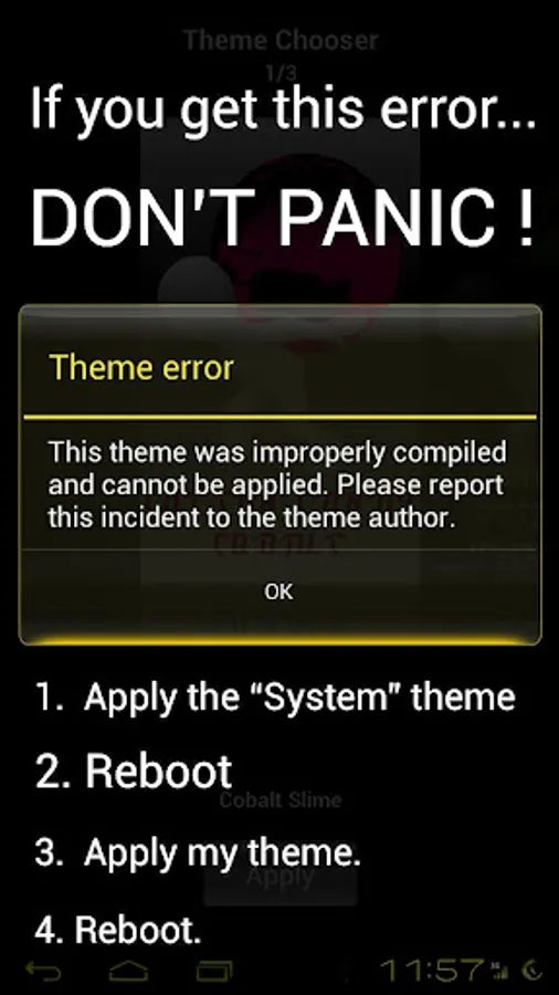 If you get an Error Message stating that the theme was "Improperly Compiled..." just apply the "system" theme, and reboot your phone. Once your device boots back up go back into the Theme Chooser and apply Canary Cobalt.