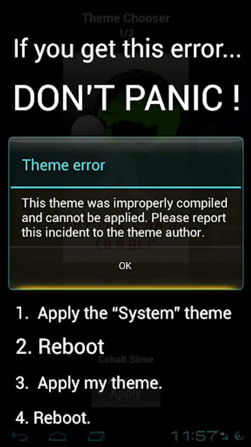 If you get an Error Message stating that the theme was "Improperly Compiled..." just apply the "system" theme, and reboot your phone. Once your device boots back up go back into the Theme Chooser and apply CyanOrangen Cobalt.