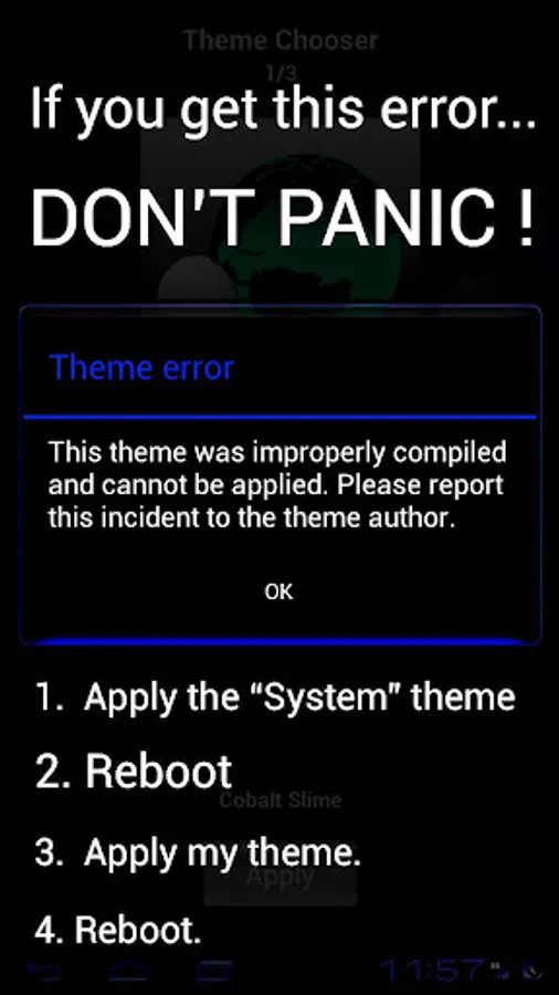 If you get an Error Message stating that the theme was "Improperly Compiled..." just apply the "system" theme, and reboot your phone. Once your device boots back up go back into the Theme Chooser and apply Royal Blue Cobalt.