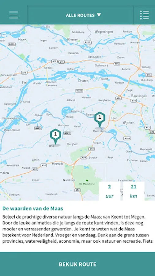 In this app you will find walking and cycling routes along the Maas. More routes will be added over time, as we are still developing. Some locations along the route have been enriched with so-called Augmented Reality experiences. "Scan" with your phone (when prompted) the ground and an animation will appear. It's a real three-dimensional animation so you can go there and even walk around it. Fun animations have been placed in the experiences in various places. So take a good look around :-)