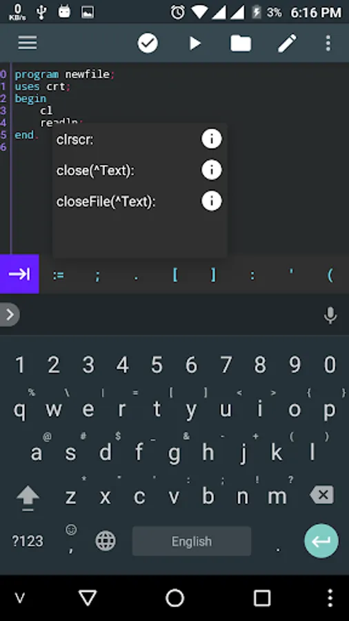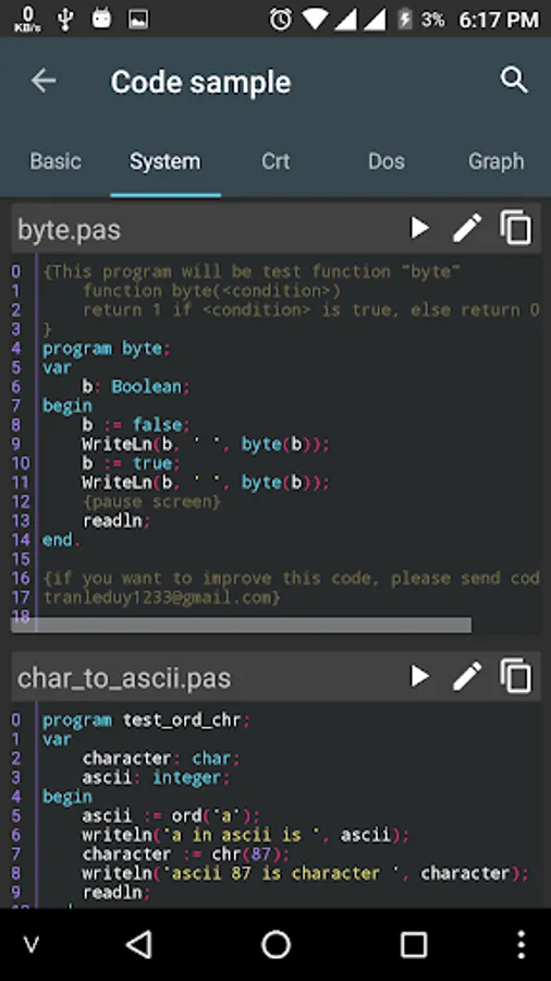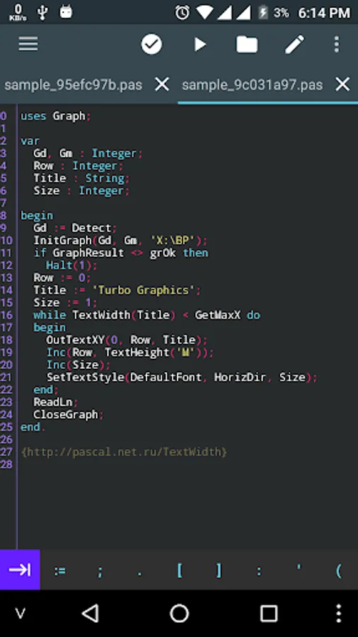 The application is a Pascal interpreter on Android. This application is for everyone to learn Pascal on the mobile without a computer, so that we can practice anytime, anywhere.