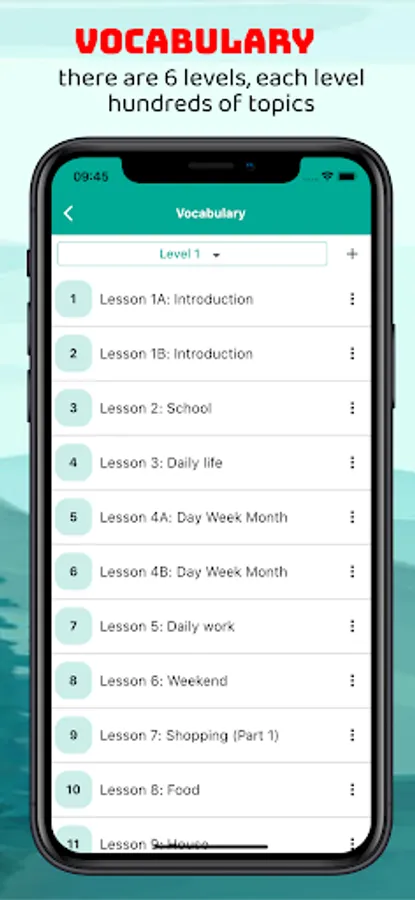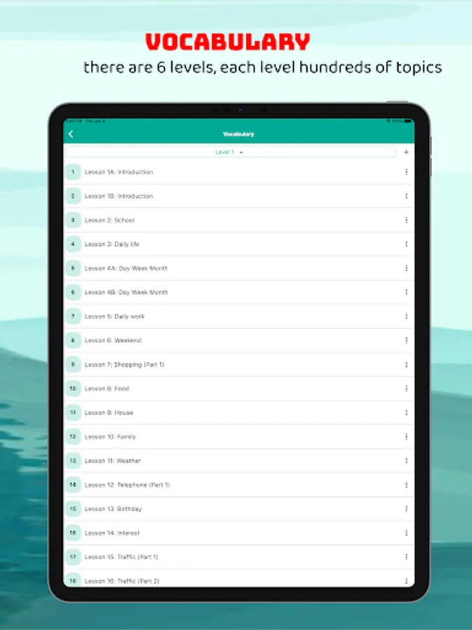 - Vocabulary by levels, topics, flashcard mode to increase memorization ability, speaking mode to increase correct pronunciation