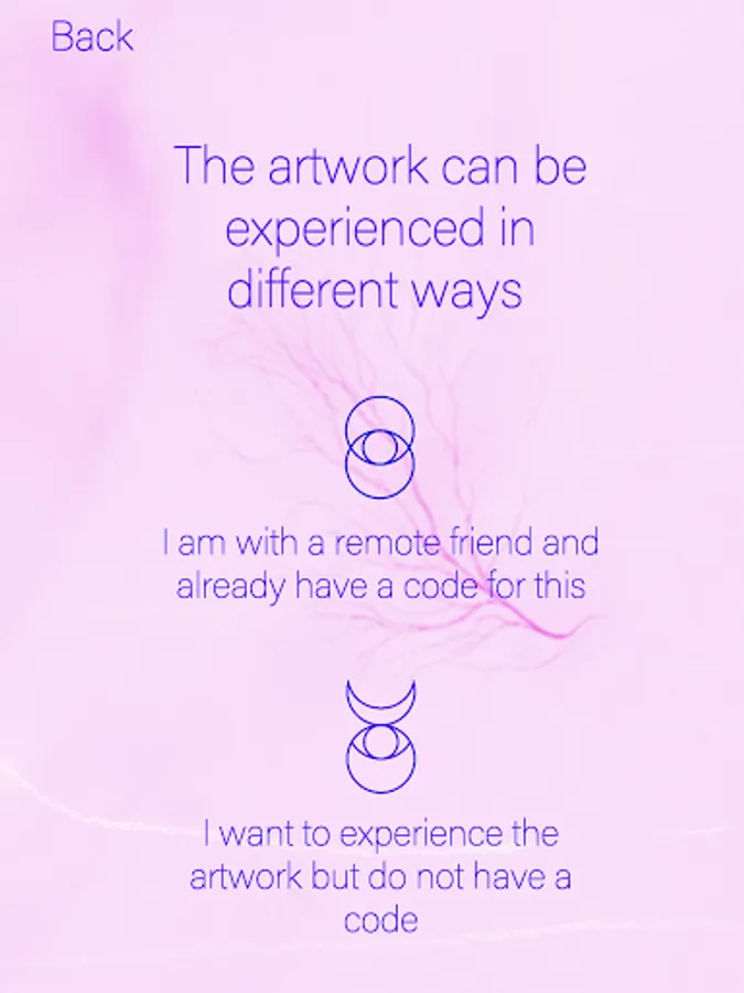 The artwork is accessible to enter 24/7. From a distance you can enter the piece at the same time as someone you know. The app will ask you to share a unique code between each other in order to connect and experience the artwork together.