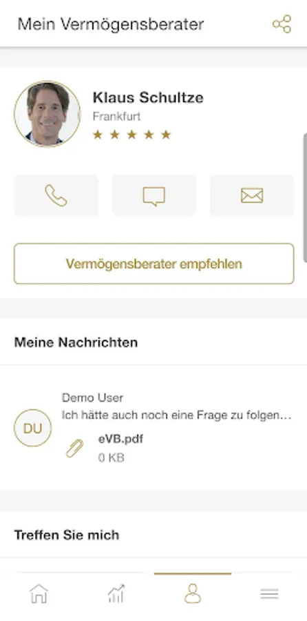 Contact your investment advisor by phone, email or SMS directly from MeineApp. Make an appointment and call up the contact details and opening times of your investment advisor. The interactive map with route planner shows you the quickest route to your asset advisor's office.