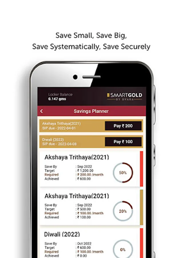 Set a life goal, start savings regularly in SIPs and convert your accumulated savings into cash, coins/pendants or jewellery at a jeweller near you.