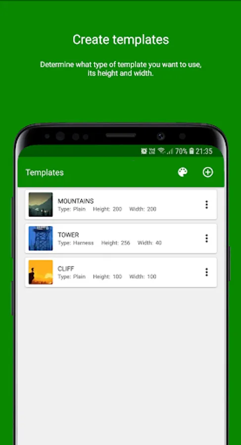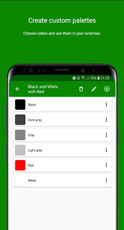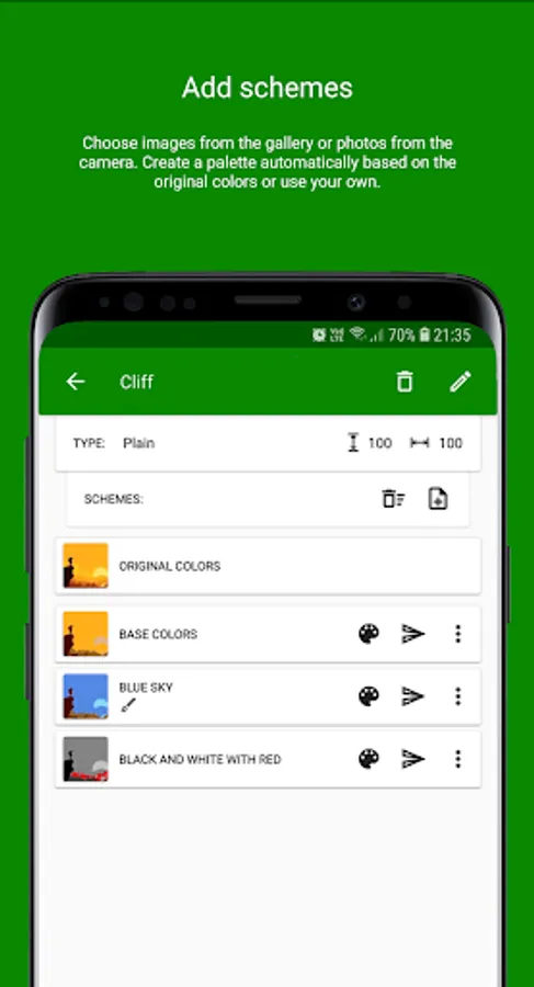 Add schemes: select images from the gallery or photos from the camera. Create a palette automatically based on the original colors or use your own.