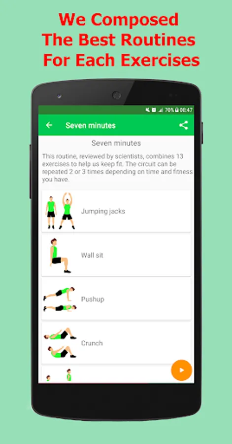 You can create your own and continue to improve your fitness while having fun! Choose from more than 100 exercises. We will be adding more and more exercises continuously. If you want one in particular just let us know! let daily workout or at least 4 days per week to improve muscle, body and strength with Home workouts app.