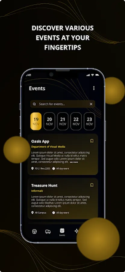 Stay updated and get notified with all the events happening on campus sorted by timings and location. Search for your favorite events by name, description and organizer.