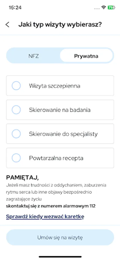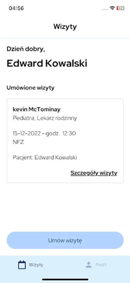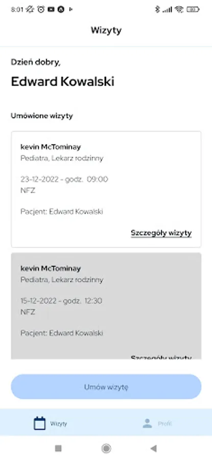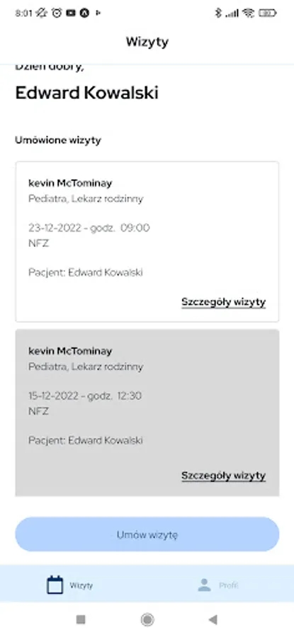 The application user will be able to arrange a doctor's appointment / teleconsultation (NFZ or privately), as well as his charges and cancel appointments. Using the application, the user will also be able to apply for a referral for tests / to a specialist, issuing a repeatable prescription and making an appointment for a vaccination visit. In addition, the option to view details of visits, notifications about them, edit user data, add / remove charges / change password / log out of the application will be available.