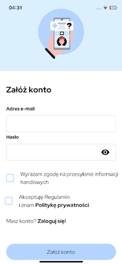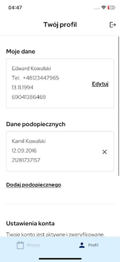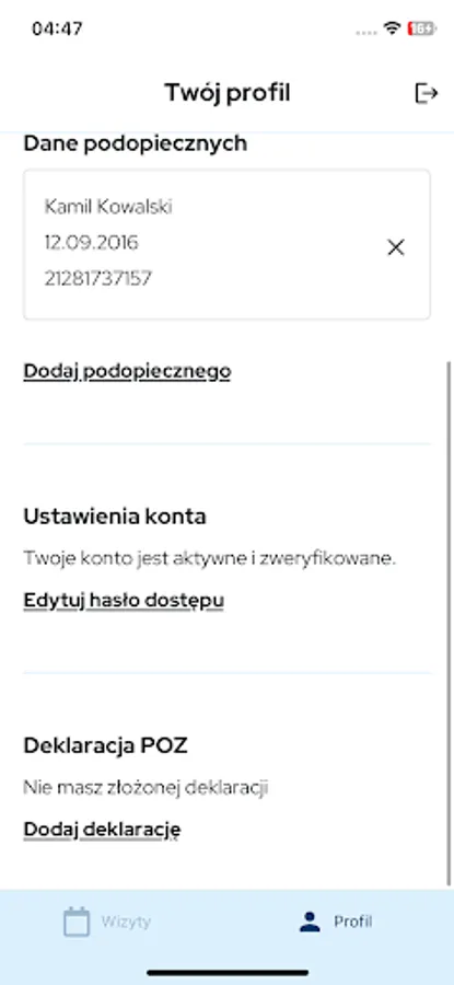 After installation, the user should register an account, confirm it by e-mail, approve the regulations and consents and log in. In order to use the full functionality of the application, he should verify his account during a personal visit to a primary healthcare facility (POZ).