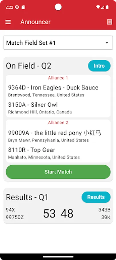 Announcers and emcees can use TM Mobile to see information about the teams in the current match and recently scored matches, control the audience display, conduct alliance selection, and start matches all from their mobile device.