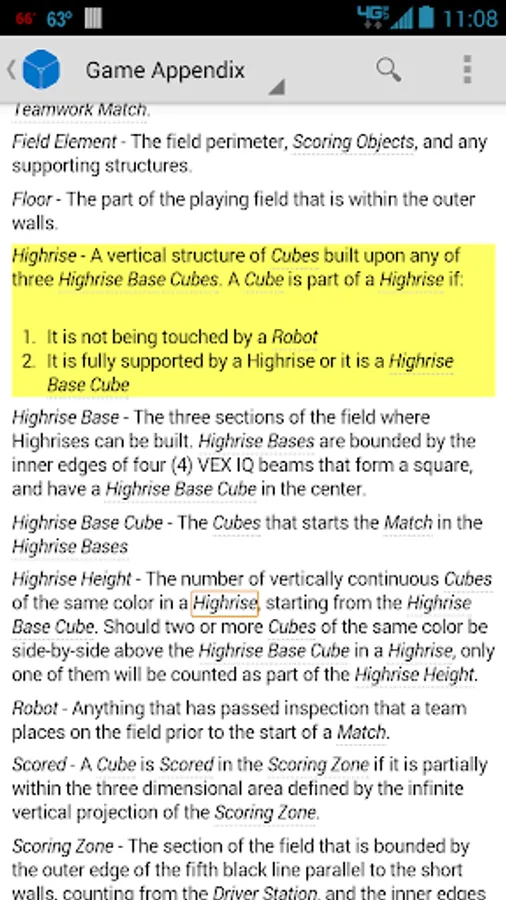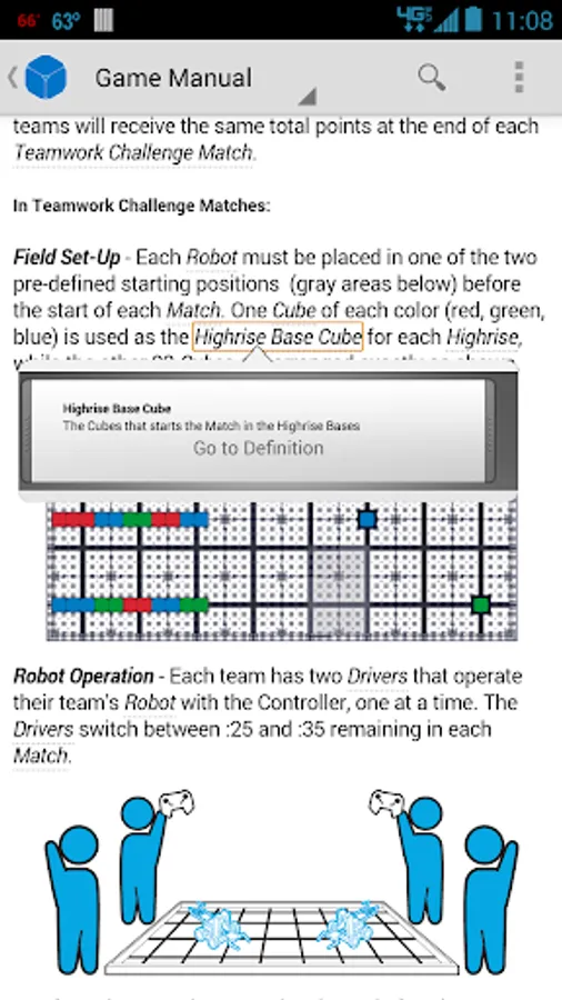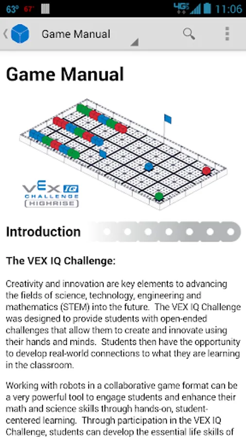 The VEX IQ Highrise App is the ideal competition companion for teams, spectators, and event planners involved in the 2014-2015 VEX IQ Challenge season. The app provides quick access to the official game manual with search capability, including in-app alerts when new versions of the manual are released. Additionally, a helpful scoring calculator for Highrise is provided for use during practice matches or while evaluating game strategies.