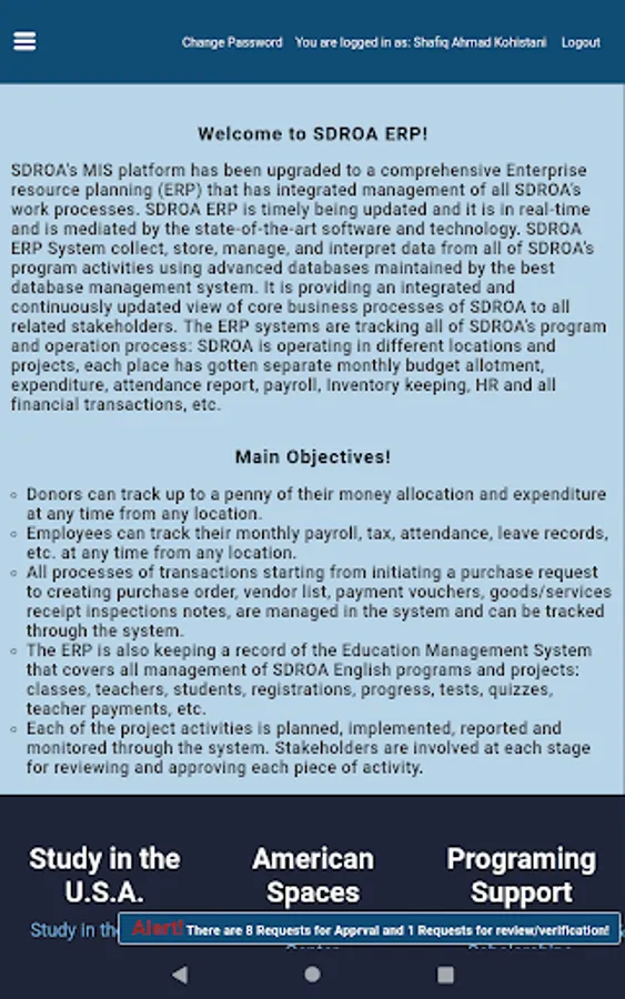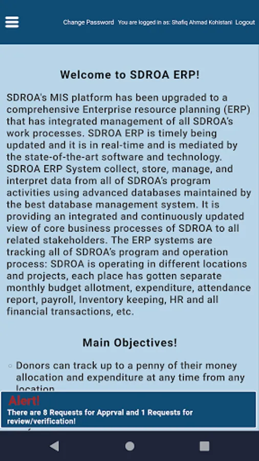 SDROA's MIS platform has been upgraded to a comprehensive Enterprise resource planning (ERP) that has integrated management of all SDROA’s work processes. SDROA ERP is timely being updated and it is in real-time and is mediated by the state-of-the-art software and technology. SDROA ERP System collect, store, manage, and interpret data from all of SDROA’s program activities using advanced databases maintained by the best database management system. It is providing an integrated and continuously updated view of core business processes of SDROA to all related stakeholders. The ERP systems are tracking all of SDROA’s program and operation process: SDROA is operating in different locations and projects, each place has gotten separate monthly budget allotment, expenditure, attendance report, payroll, Inventory keeping, HR and all financial transactions, etc.