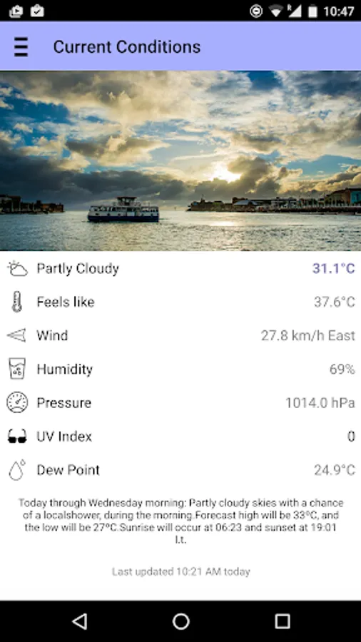 Curaçao Weather is the official weather app for the Dutch Caribbean island of Curaçao. Developed in cooperation with the Meterological Department of Curaçao (Meteo), it brings you first-hand and up-to-date information about current weather conditions and forecasts.