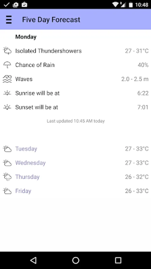 Highlights include: Current weather, updated every 30 minutes. Detailed textual summary and outlook. Five-day forecast. Up-to-date radar and satellite imagery. And much much more. All rounded off by stunning photography from the island.