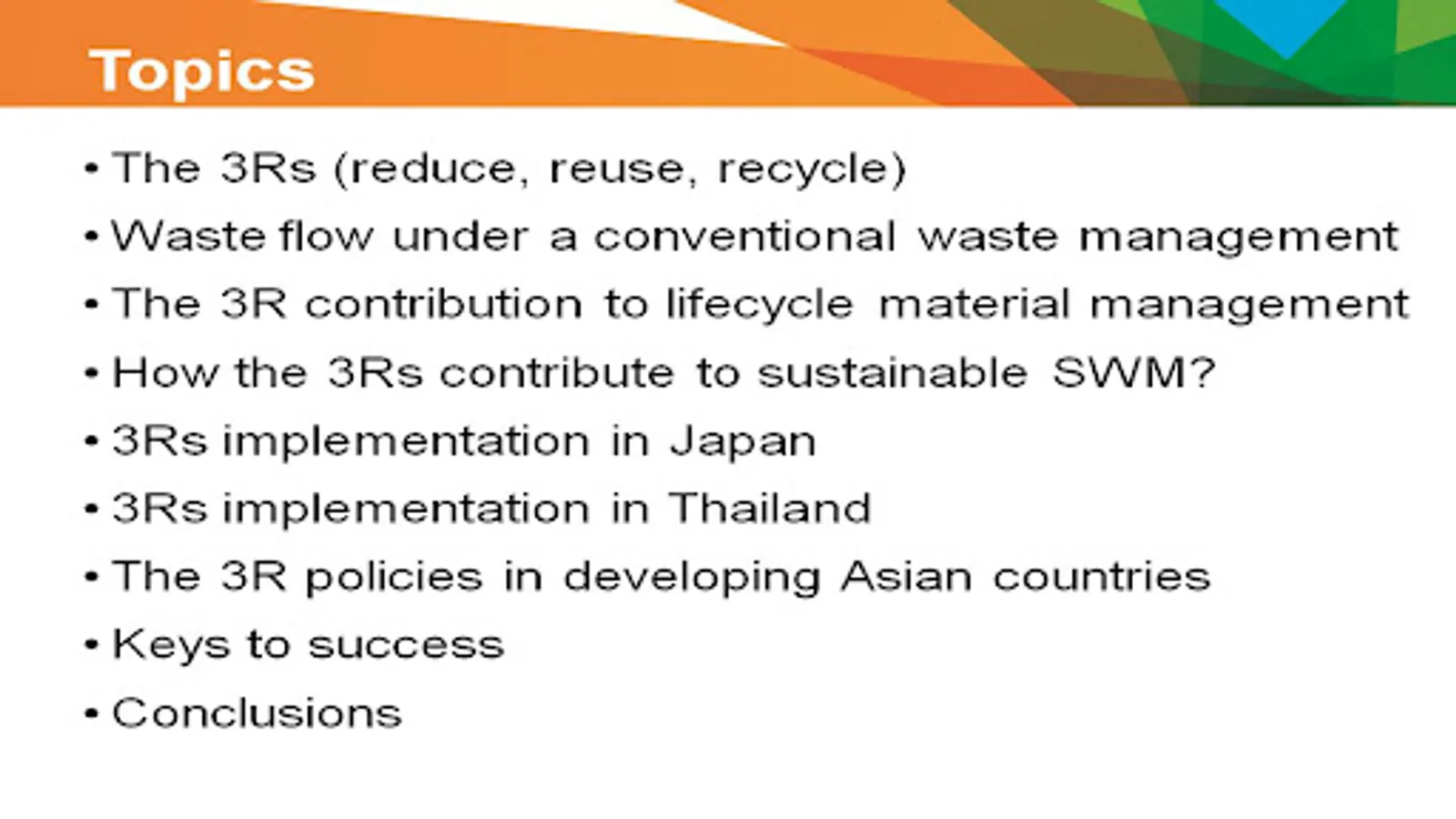 The contribution of the 3R concept to sustainable solid waste management along with two examples from Japan and Thailand are presented in this presentation. The presentation was made by Janya San-Arun at the BNDES public seminar “Αlternative technology for the treatment of solid waste”, which was held in Recife on 16 May 2012.