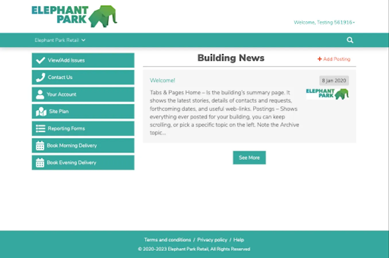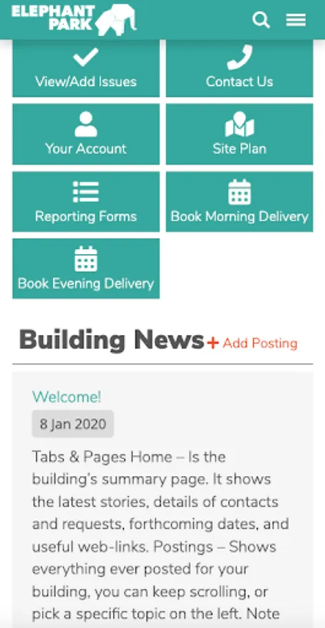 – Is the building’s summary page. It shows the latest stories, details of contacts and requests, forthcoming dates, and useful web-links.