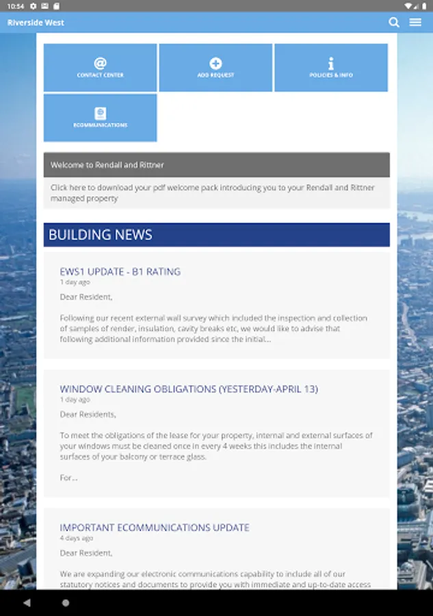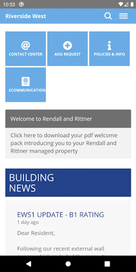 – Is the building’s summary page. It shows the latest stories, details of contacts and requests, forthcoming dates, and useful web-links.