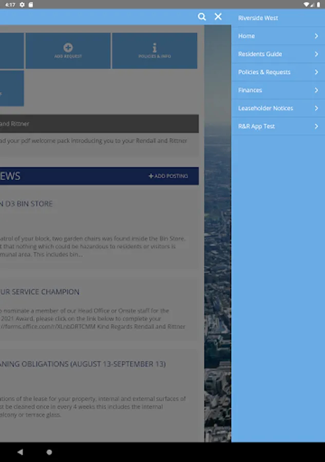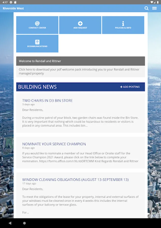 – Is the building’s summary page. It shows the latest stories, details of contacts and requests, forthcoming dates, and useful web-links.