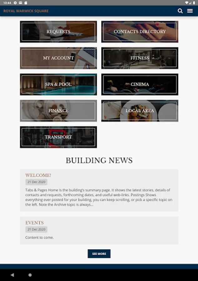 – Is the building’s summary page. It shows the latest stories, details of contacts and requests, forthcoming dates, and useful web-links.