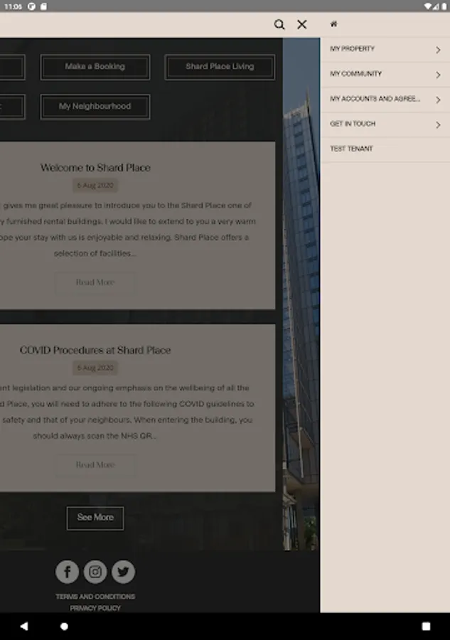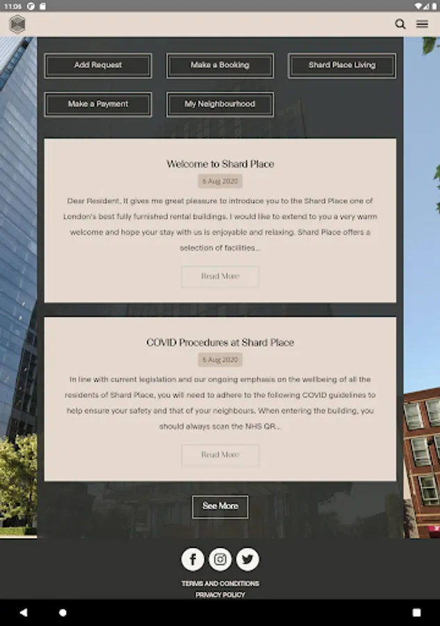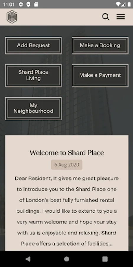 – Is the building’s summary page. It shows the latest stories, details of contacts and requests, forthcoming dates, and useful web-links.