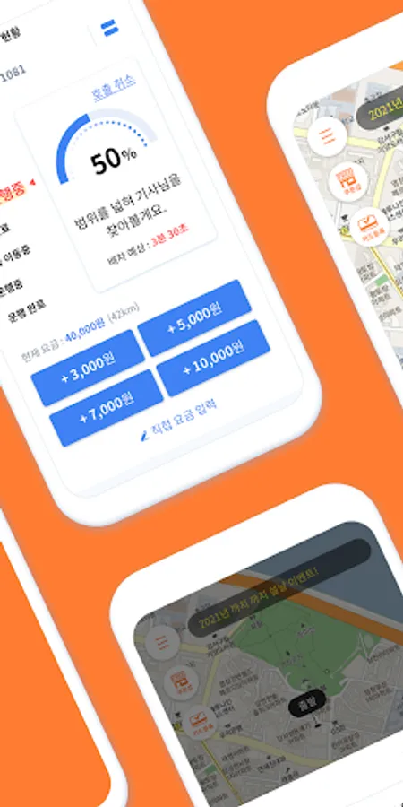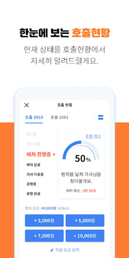3) 요금 산정: 최적의 로직으로 빠르게 배차될 수 있는 가장 합리적인 가격을 제시합니다. 물론 요금은 스스로 조정할 수도 있습니다.