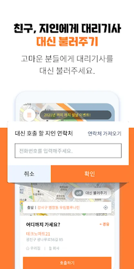 2) 대신불러주기: 친구나 지인의 대리운전 기사를 대신 호출(결제 포함)하는 기능을 제공합니다. 동시에 여러 건을 대신 불러줄 수 있기에 술자리에서 음주운전을 막아주는 멋진 사람이 될 수 있습니다.