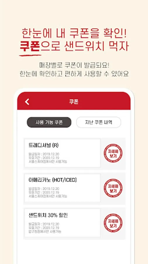 2) Coupon: You can check the information (coupon name, description, expiration date, etc.) of the coupon currently available. You can also use the past coupon history to see information about coupons that have been redeemed or expired.