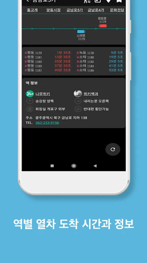 2. The arrival information of trains by Gwangju subway station is displayed using the timetable for up to 5 lines up and down.