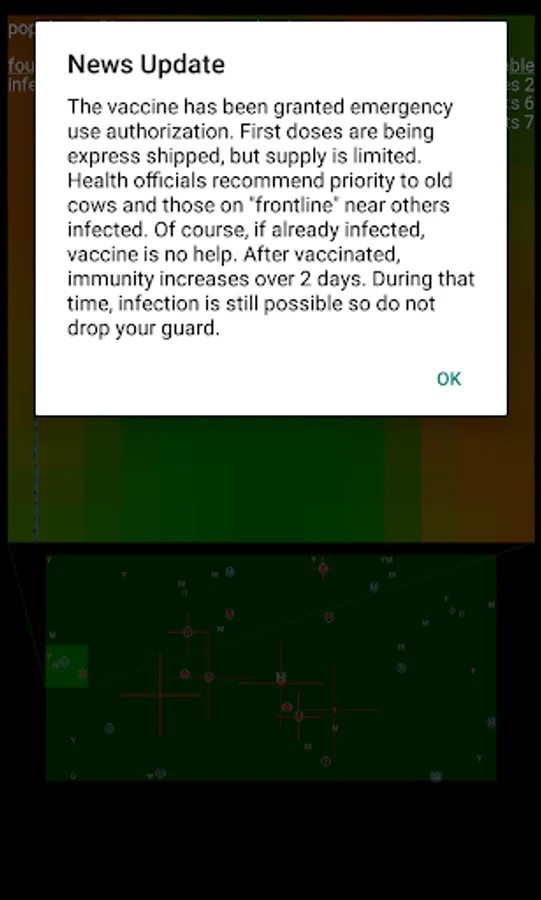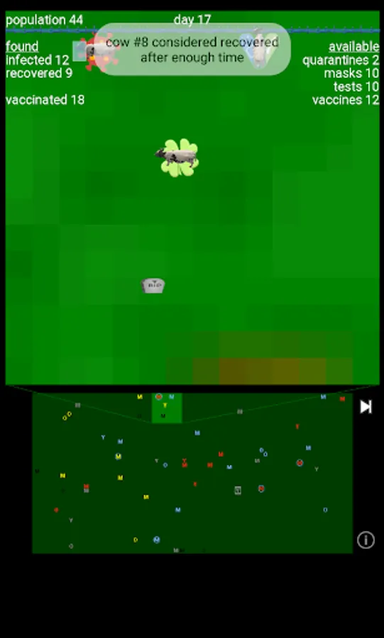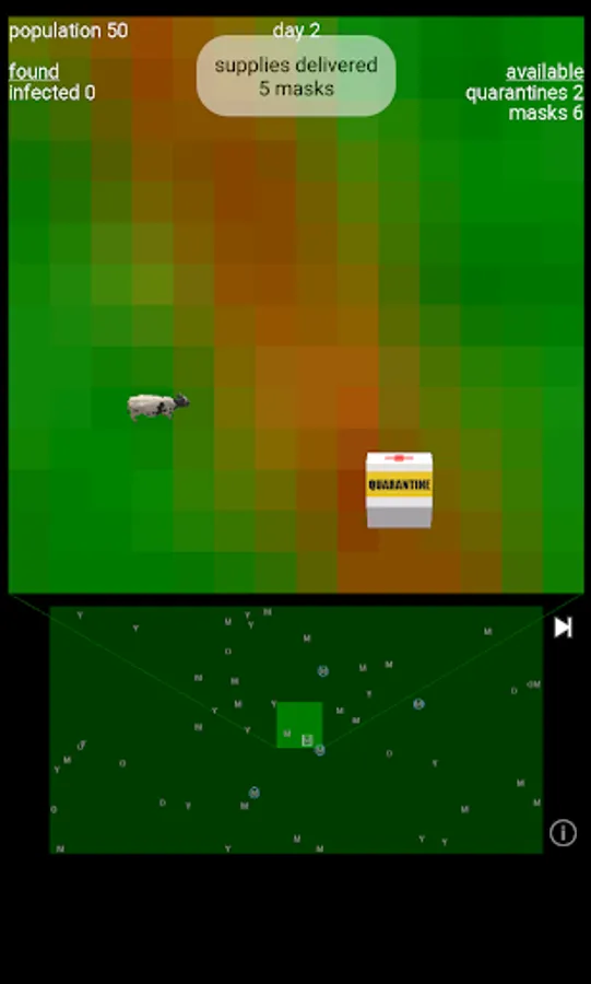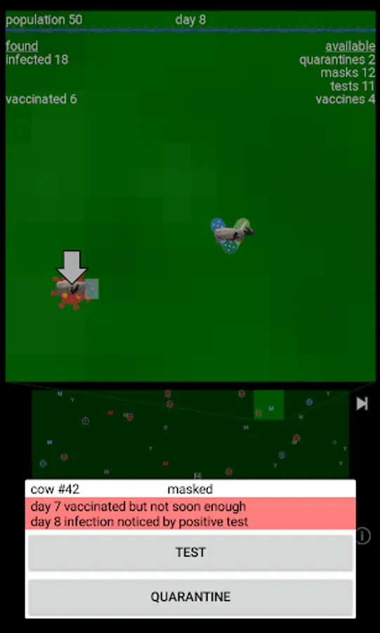You take care of a herd of cows. There is a new virus which spreads through the air and can kill. What makes identification and containment difficult is that some never get symptoms but can still infect others and supplies are limited. Other herders have hoarded things like fencing and restraints, so you cannot segregate many. You start with masks for prevention while scientists develop test and vaccine.