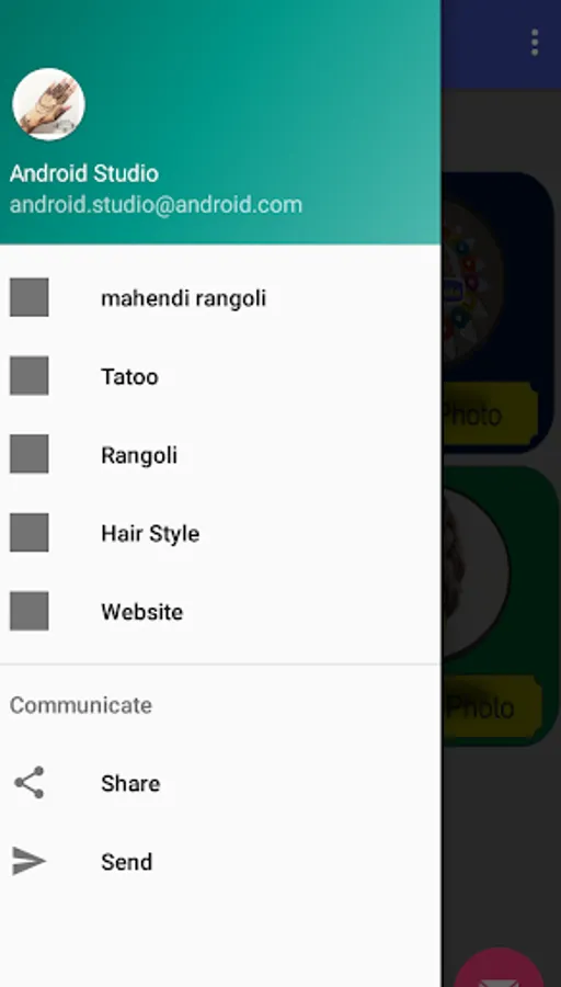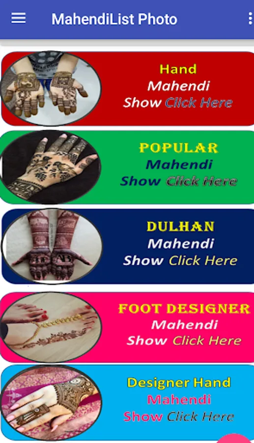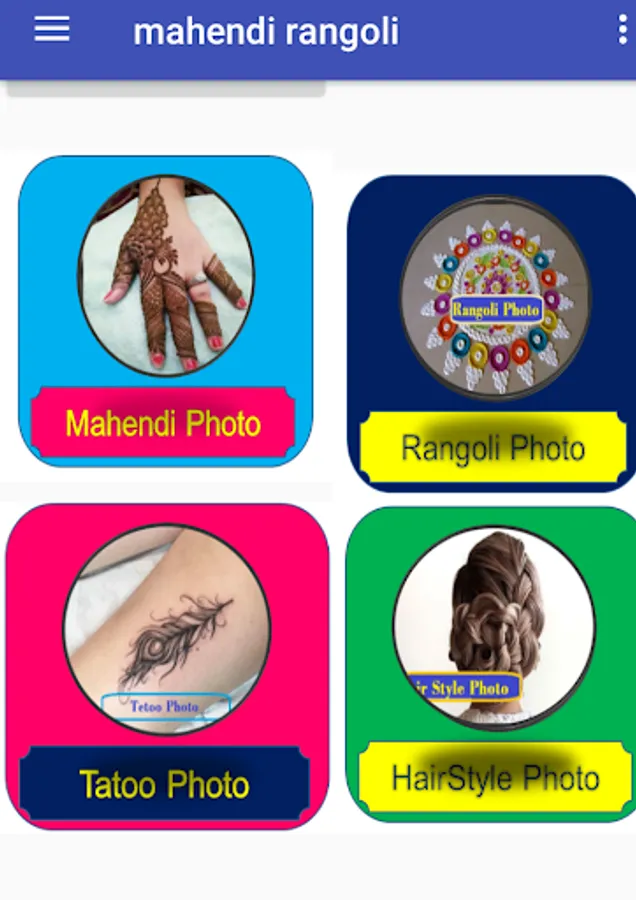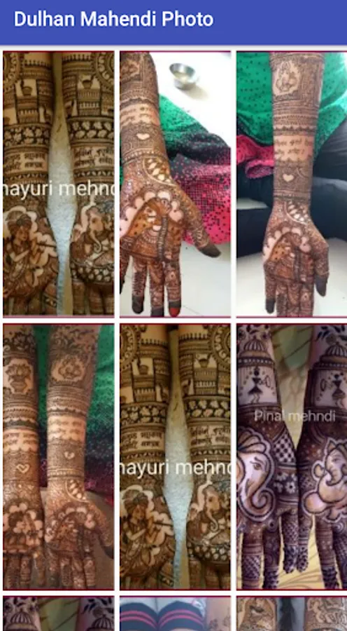 this application is collection of mahendi, rangoli, tatoo, hairstyle photo. it is also various type of mahendi photo like popular mahendi, hand mahendi, foot mahendi, dulhan mahendi. rangoli various type of dot rangoli, popular rangoli, ganesh rangoli and more. hair style is various type of dulhan hairstyle, dulhan makeup, party ware hairstyle and more...