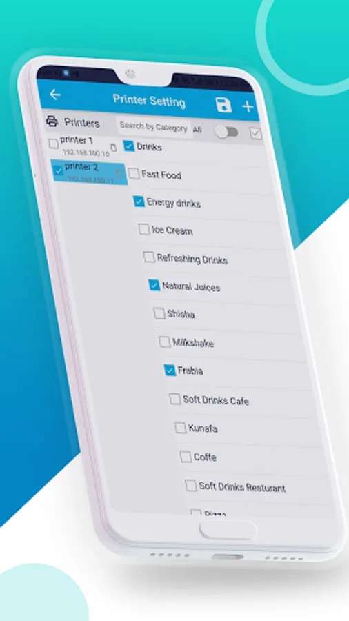In the Setting section of the Bazrgan Restaurant app, a server can easily add or remove a printer that’s used to print order tickets referenced by the cook or barista to prepare customer ordered items. The server chooses which food or beverage category is linked to a certain printer. And depending on the restaurant layout, more than one category (food and/or beverage items) can be linked to a printer.