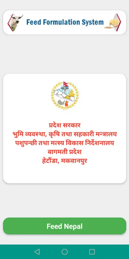 Feed Nepal is a mobile app developed by DoLFD (Directorate of Livestock and Fisheries Development), Bagamati Province, Nepal. This mobile app incorporates the system to formulate the feed using different ingredients with ease. This app primarily targets to ease the process of complex feed formulation into simpler terms that can be understood and used even by the people without the knowledge of animal nutrition. This mobile app is designed such that the government livestock extension worker can easily suggest the formulation of feed to the farmers in the local level.